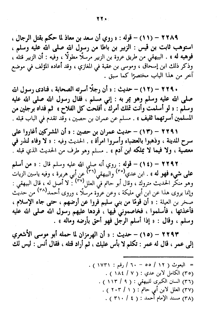 2289 - (11) - قَوْلُهُ: رُوِيَ «أَنَّ سَعْدَ بْنَ مُعَاذٍ لَمَّا حَكَمَ بِقَتْلِ الرِّجَالِ، اسْتَوْهَبَ ثَابِتُ بْنُ قَيْسٍ: الزُّبَيْرَ بْنَ بَاطَا مِنْ رَسُولِ اللَّهِ - صَلَّى اللَّهُ عَلَيْهِ وَسَلَّمَ -، فَوَهَبَهُ لَهُ» . الْبَيْهَقِيُّ مِنْ طَرِيقِ عُرْوَةَ بْنِ الزُّبَيْرِ مُرْسَلًا مُطَوَّلًا، وَفِيهِ: أَنَّ الزُّبَيْرَ قَتَلَهُ، وَذَكَرَ ذَلِكَ ابْنُ إِسْحَاقَ، وَمُوسَى بْنُ عُقْبَةَ فِي الْمَغَازِي، وَقَدْ أَعَادَهُ الْمُؤَلِّفُ فِي مَوْضِعٍ آخَرَ مِنْ هَذَا الْبَابِ مُخْتَصَرًا كَمَا سَبَقَ. 2290 - (12) - حَدِيثُ: «أَنَّ رَجُلًا أَسَرَتْهُ الصَّحَابَةُ، فَنَادَى رَسُولَ اللَّهِ - صَلَّى اللَّهُ عَلَيْهِ وَسَلَّمَ - وَهُوَ يَمُرُّ بِهِ: إنِّي مُسْلِمٌ، فَقَالَ رَسُولُ اللَّهِ - صَلَّى اللَّهُ عَلَيْهِ وَسَلَّمَ -: لَوْ أَسْلَمْت وَأَنْتَ تَمْلِكُ أَمْرَك، أَفْلَحْت كُلَّ الْفَلَاحِ ثُمَّ فَدَاهُ بِرَجُلَيْنِ مِنْ الْمُسْلِمِينَ أَسَرَتْهُمَا ثَقِيفٌ» . مُسْلِمٌ عَنْ عِمْرَانَ بْنِ حُصَيْنٍ، وَقَدْ تَقَدَّمَ فِي الْبَابِ قَبْلَهُ