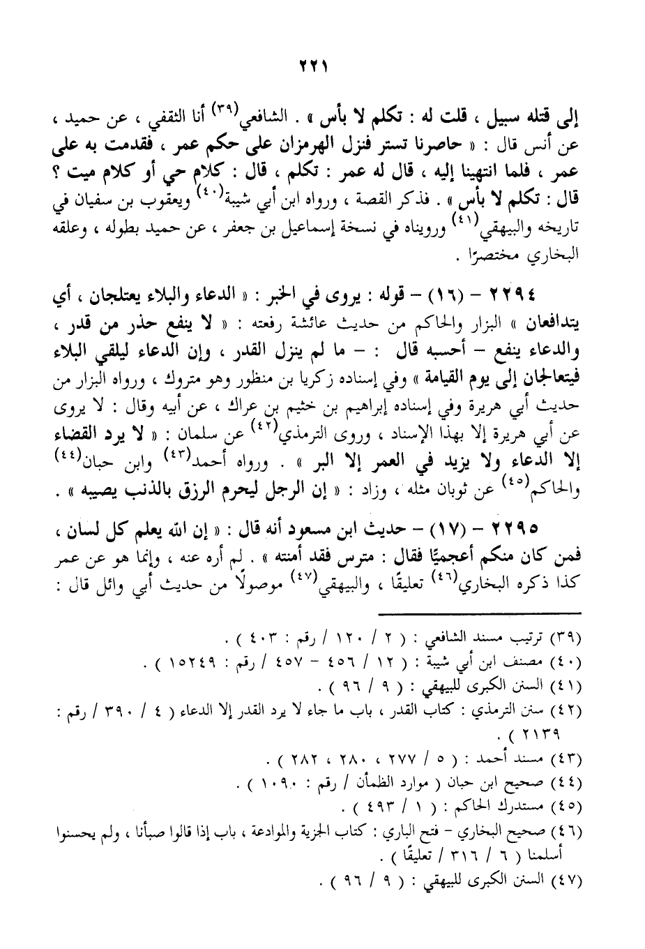 2294 - (16) - قَوْلُهُ: يُرْوَى فِي الْخَبَرِ: «الدُّعَاءُ وَالْبَلَاءُ يَعْتَلِجَانِ، أَيْ يَتَدَافَعَانِ» الْبَزَّارُ وَالْحَاكِمُ مِنْ حَدِيثِ عَائِشَةَ رَفَعَتْهُ: «لَا يَنْفَعُ حَذَرٌ مِنْ قَدْرٍ، وَالدُّعَاءُ يَنْفَعُ - أَحْسَبُهُ قَالَ: - مَا لَمْ يَنْزِلْ الْقَدْرُ، وَإِنَّ الدُّعَاءَ لِيَلْقَى الْبَلَاءَ فَيَتَعَالَجَانِ إلَى يَوْمِ الْقِيَامَةِ» وَفِي إسْنَادِهِ زَكَرِيَّا بْنُ مَنْظُورٍ وَهُوَ مَتْرُوكٌ، وَرَوَاهُ الْبَزَّارُ مِنْ حَدِيثِ أَبِي هُرَيْرَةَ وَفِي إسْنَادِهِ إبْرَاهِيمُ بْنُ خُثَيْمِ بْنِ عِرَاكٍ، عَنْ أَبِيهِ وَقَالَ: لَا يُرْوَى عَنْ أَبِي هُرَيْرَةَ إلَّا بِهَذَا الْإِسْنَادِ، وَرَوَى التِّرْمِذِيُّ عَنْ سَلْمَانَ: «لَا يَرُدُّ الْقَضَاءَ إلَّا الدُّعَاءُ وَلَا يَزِيدُ فِي الْعُمْرِ إلَّا الْبِرُّ» . وَرَوَاهُ أَحْمَدُ وَابْنُ حِبَّانَ وَالْحَاكِمُ عَنْ ثَوْبَانَ مِثْلَهُ، وَزَادَ: «إنَّ الرَّجُلَ لَيُحْرَمُ الرِّزْقَ بِالذَّنْبِ يُصِيبُهُ» .