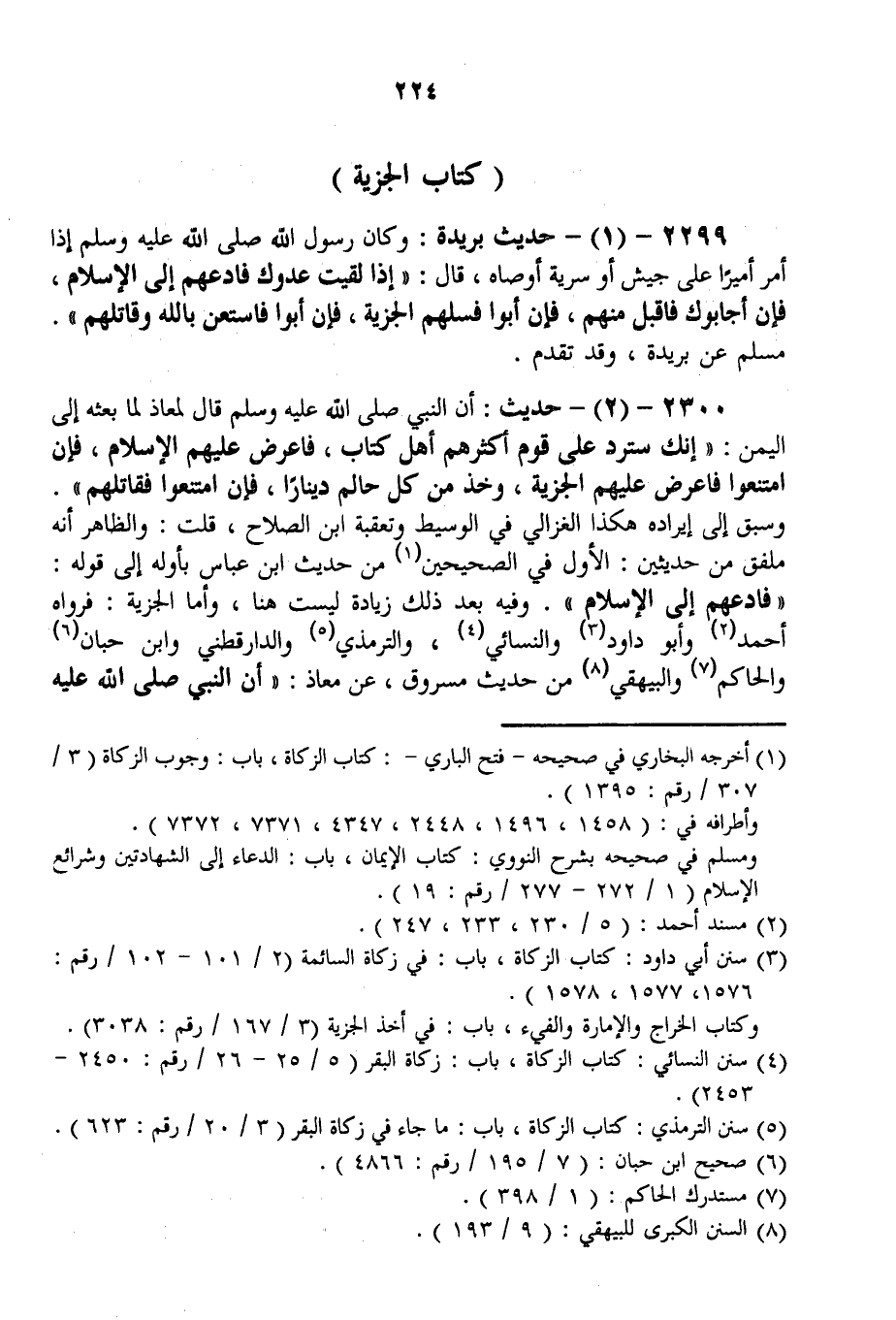 2299 - (1) - حَدِيثُ بُرَيْدَةَ: «وَكَانَ رَسُولُ اللَّهِ - صَلَّى اللَّهُ عَلَيْهِ وَسَلَّمَ - إذَا أَمَّرَ أَمِيرًا عَلَى جَيْشٍ أَوْ سَرِيَّةٍ أَوْصَاهُ، قَالَ: إذَا لَقِيت عَدُوَّك فَادْعُهُمْ إلَى الْإِسْلَامِ، فَإِنْ أَجَابُوك فَاقْبَلْ مِنْهُمْ، فَإِنْ أَبَوْا فَسَلْهُمْ الْجِزْيَةَ، فَإِنْ أَبَوْا فَاسْتَعِنْ بِاَللَّهِ وَقَاتِلْهُمْ» . مُسْلِمٌ عَنْ بُرَيْدَةَ، وَقَدْ تَقَدَّمَ.