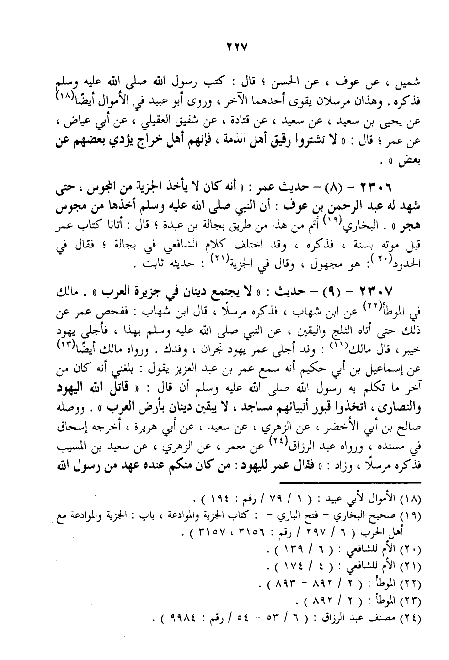 2307 - (9) - حَدِيثُ: «لَا يَجْتَمِعُ دِينَانِ فِي جَزِيرَةِ الْعَرَبِ» . مَالِكٌ فِي الْمُوَطَّأِ عَنْ ابْنِ شِهَابٍ، فَذَكَرَهُ مُرْسَلًا، قَالَ ابْنُ شِهَابٍ: فَفَحَصَ عُمَرُ عَنْ ذَلِكَ حَتَّى أَتَاهُ الثَّلْجُ وَالْيَقِينُ، عَنْ النَّبِيِّ - صَلَّى اللَّهُ عَلَيْهِ وَسَلَّمَ - بِهَذَا، فَأَجْلَى يَهُودَ خَيْبَرَ، قَالَ مَالِكٌ: وَقَدْ أَجْلَى عُمَرُ يَهُودَ نَجْرَانَ، وَفَدَكَ.، وَرَوَاهُ مَالِكٌ أَيْضًا عَنْ إسْمَاعِيلَ بْنِ أَبِي حَكِيمٍ أَنَّهُ سَمِعَ عُمَرَ بْنَ عَبْدِ الْعَزِيزِ يَقُولُ: بَلَغَنِي أَنَّهُ كَانَ مِنْ «آخِرِ مَا تَكَلَّمَ بِهِ رَسُولُ اللَّهِ - صَلَّى اللَّهُ عَلَيْهِ وَسَلَّمَ - أَنْ قَالَ: قَاتَلَ اللَّهُ الْيَهُودُ وَالنَّصَارَى، اتَّخَذُوا قُبُورَ أَنْبِيَائِهِمْ مَسَاجِدَ، لَا يَبْقَيَنَّ دِينَانِ بِأَرْضِ الْعَرَبِ» .