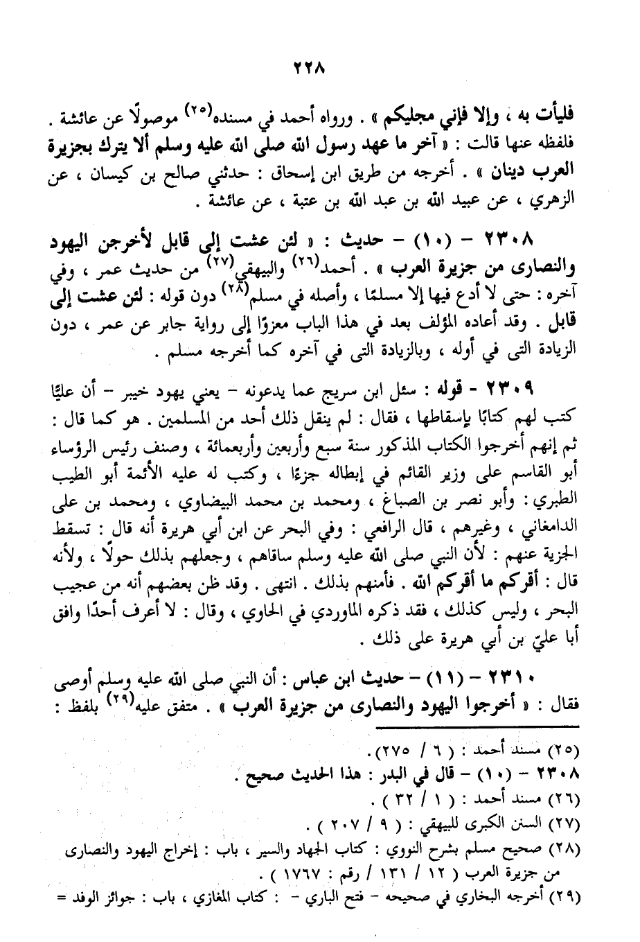 2308 - (10) - حَدِيثُ: «لَئِنْ عِشْتُ إلَى قَابِلٍ لِأُخْرِجَنَّ الْيَهُودَ وَالنَّصَارَى مِنْ جَزِيرَةِ الْعَرَبِ» . أَحْمَدُ وَالْبَيْهَقِيُّ مِنْ حَدِيثِ عُمَرَ، وَفِي آخِرِهِ: «حَتَّى لَا أَدَعَ فِيهَا إلَّا مُسْلِمًا» ، وَأَصْلُهُ فِي مُسْلِمٍ دُونَ قَوْلِهِ: «لَئِنْ عِشْت إلَى قَابِلٍ» . وَقَدْ أَعَادَهُ الْمُؤَلِّفُ بَعْدُ فِي هَذَا الْبَابِ مَعْزُوًّا إلَى رِوَايَةِ جَابِرٍ عَنْ عُمَرَ، دُونَ الزِّيَادَةِ الَّتِي فِي أَوَّلِهِ، وَبِالزِّيَادَةِ الَّتِي فِي آخِرِهِ كَمَا أَخْرَجَهُ مُسْلِمٌ.