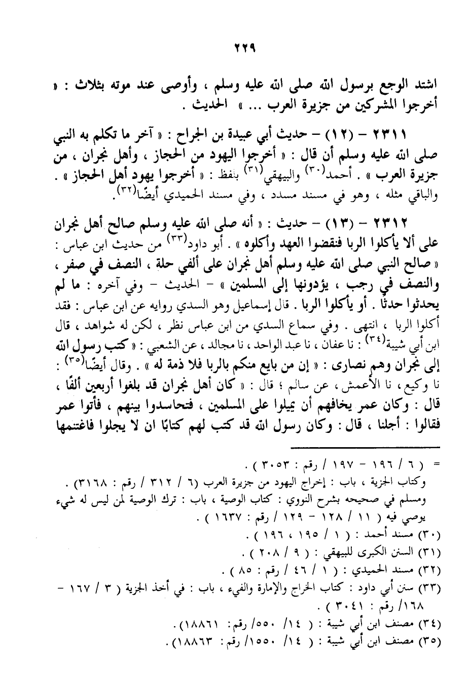 2311 - (12) - حَدِيثُ أَبِي عُبَيْدَةَ بْنِ الْجَرَّاحِ: «آخِرُ مَا تَكَلَّمَ بِهِ النَّبِيُّ - صَلَّى اللَّهُ عَلَيْهِ وَسَلَّمَ - أَنْ قَالَ: أَخْرِجُوا الْيَهُودَ مِنْ الْحِجَازِ، وَأَهْلَ نَجْرَانَ، مِنْ جَزِيرَةِ الْعَرَبِ» . أَحْمَدُ وَالْبَيْهَقِيُّ بِلَفْظِ: «أَخْرِجُوا يَهُودَ أَهْلِ الْحِجَازِ» . وَالْبَاقِي مِثْلُهُ، وَهُوَ فِي مُسْنَدِ مُسَدَّدٍ، وَفِي مُسْنَدِ الْحُمَيْدِيِّ أَيْضًا.