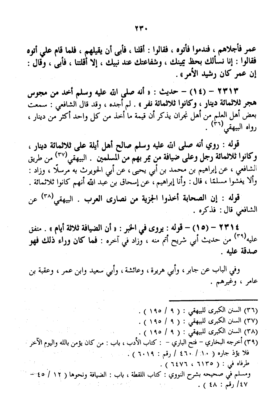 2313 - (14) - حَدِيثُ: «أَنَّهُ - صَلَّى اللَّهُ عَلَيْهِ وَسَلَّمَ - أَخَذَ مِنْ مَجُوسِ هَجَرَ ثَلَاثَمِائَةِ دِينَارٍ، وَكَانُوا ثَلَاثَمِائَةِ نَفَرٍ» . لَمْ أَجِدْهُ، وَقَدْ قَالَ الشَّافِعِيُّ: سَمِعْت بَعْضَ أَهْلِ الْعِلْمِ مِنْ أَهْلِ نَجْرَانَ يَذْكُرُ أَنَّ قِيمَةَ مَا أَخَذَ مِنْ كُلِّ وَاحِدٍ أَكْثَرُ مِنْ دِينَارٍ، رَوَاهُ الْبَيْهَقِيُّ.