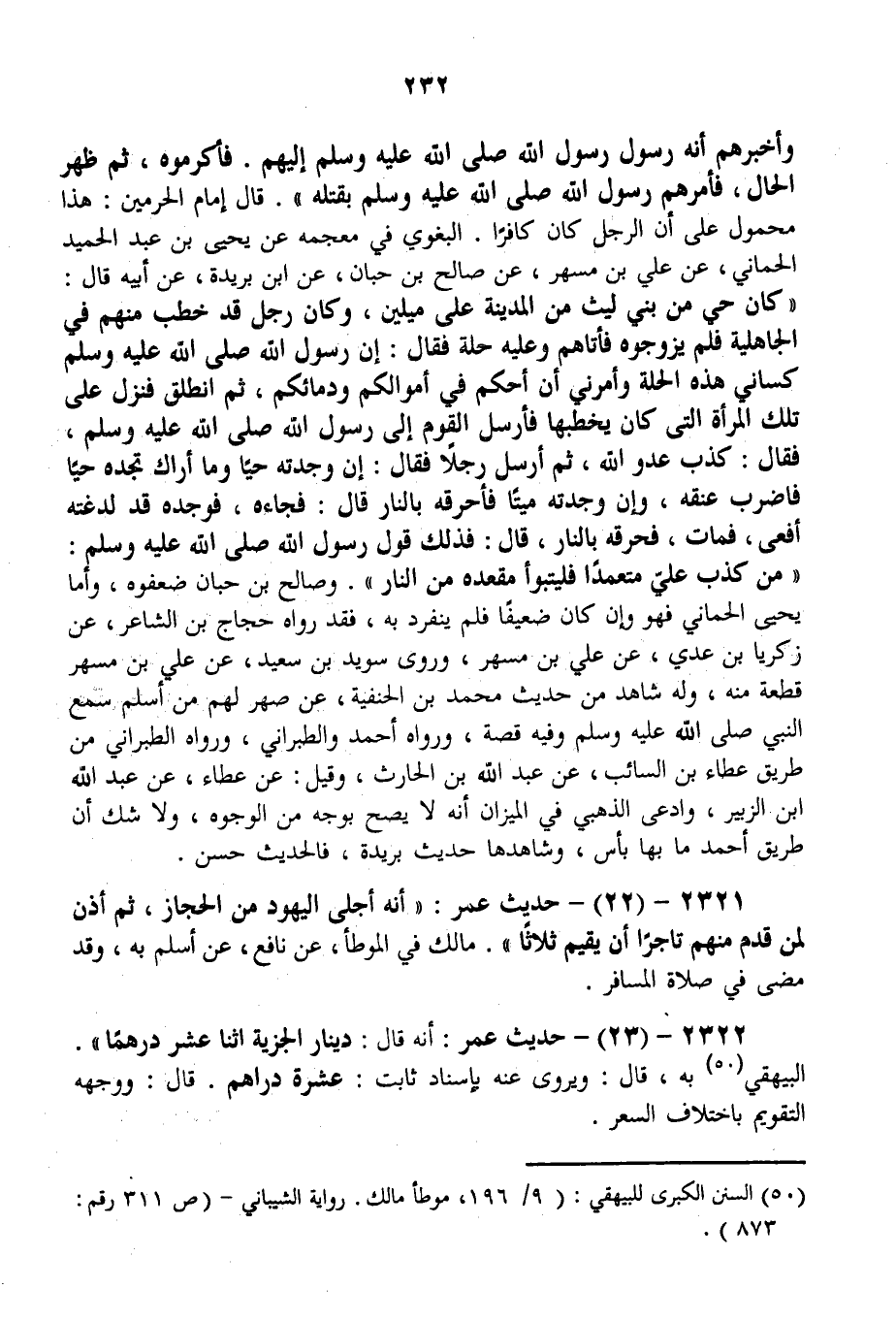 2321 - (22) - حَدِيثُ عُمَرَ: " أَنَّهُ أَجْلَى الْيَهُودَ مِنْ الْحِجَازِ، ثُمَّ أَذِنَ لِمَنْ قَدِمَ مِنْهُمْ تَاجِرًا أَنْ يُقِيمَ ثَلَاثًا ". مَالِكٌ فِي الْمُوَطَّأِ، عَنْ نَافِعٍ، عَنْ أَسْلَمَ بِهِ، وَقَدْ مَضَى فِي صَلَاةِ الْمُسَافِرِ. 2322 - (23) - حَدِيثُ عُمَرَ: أَنَّهُ قَالَ: دِينَارُ الْجِزْيَةِ اثْنَا عَشَرَ دِرْهَمًا ". الْبَيْهَقِيُّ بِهِ، قَالَ: وَيُرْوَى عَنْهُ بِإِسْنَادٍ ثَابِتٍ: عَشَرَةُ دَرَاهِمَ. قَالَ: وَوَجْهُهُ التَّقْوِيمُ بِاخْتِلَافِ السِّعْرِ.