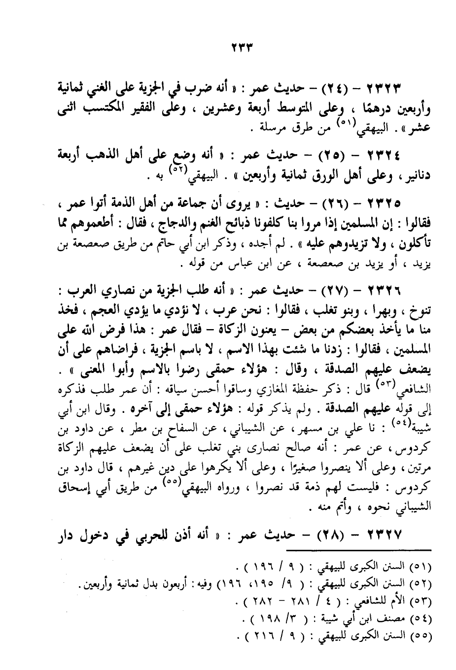 حَدِيثُ عُمَرَ: " أَنَّهُ ضَرَبَ فِي الْجِزْيَةِ عَلَى الْغَنِيِّ ثَمَانِيَةً وَأَرْبَعِينَ دِرْهَمًا، وَعَلَى الْمُتَوَسِّطِ أَرْبَعَةً وَعِشْرِينَ، وَعَلَى الْفَقِيرِ الْمُكْتَسِبِ اثْنَيْ عَشَرَ ". الْبَيْهَقِيُّ مِنْ طُرُقٍ مُرْسَلَةٍ. 2324 - (25) - حَدِيثُ عُمَرَ: " أَنَّهُ وَضَعَ عَلَى أَهْلِ الذَّهَبِ أَرْبَعَةَ دَنَانِيرَ، وَعَلَى أَهْلِ الْوَرِقِ ثَمَانِيَةً وَأَرْبَعِينَ ". الْبَيْهَقِيُّ بِهِ.