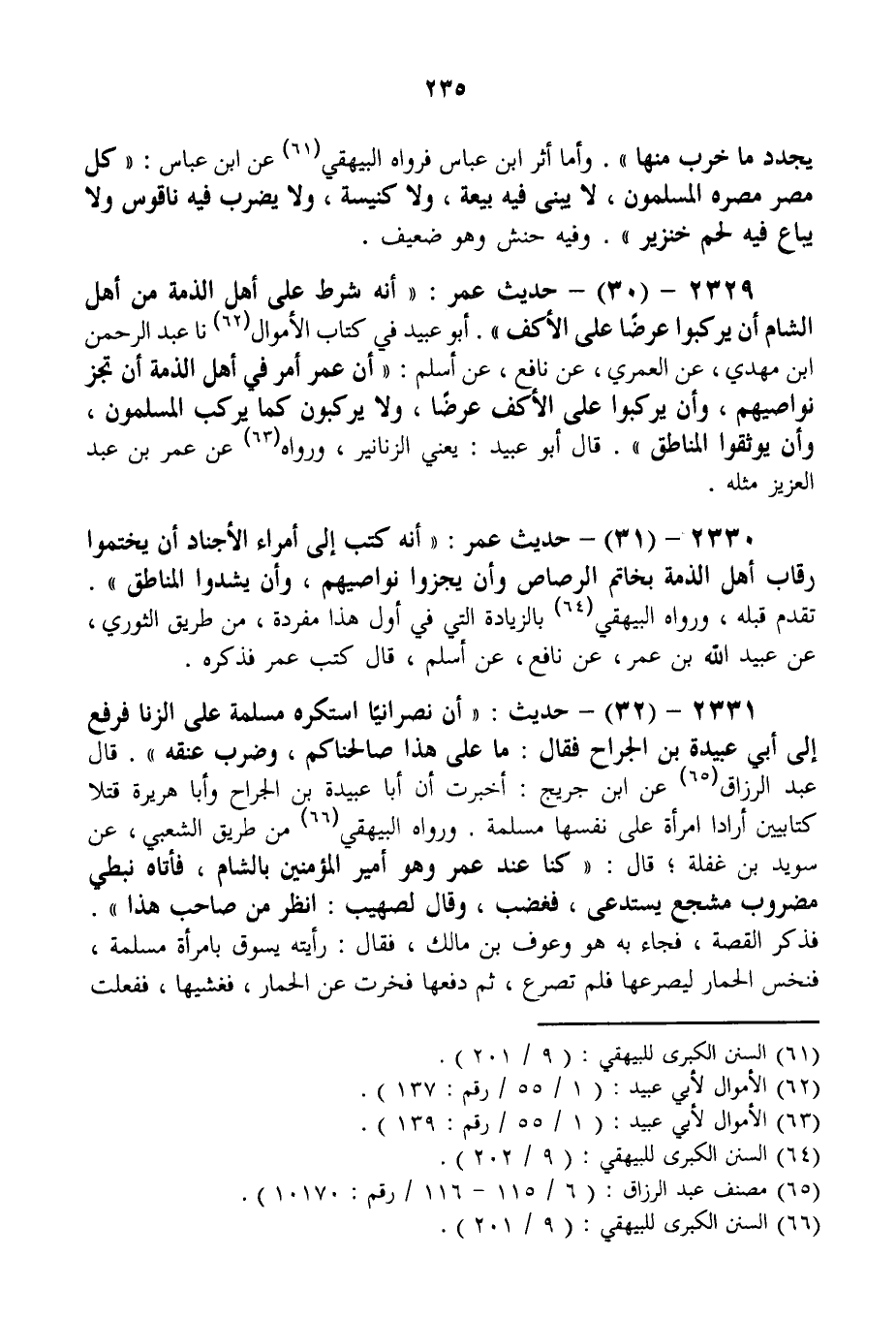 2329 - (30) - حَدِيثُ عُمَرَ: " أَنَّهُ شَرَطَ عَلَى أَهْلِ الذِّمَّةِ مِنْ أَهْلِ الشَّامِ أَنْ يَرْكَبُوا عَرْضًا عَلَى الْأَكُفِّ ". أَبُو عُبَيْدٍ فِي كِتَابِ الْأَمْوَالِ نا عَبْدُ الرَّحْمَنِ بْنُ مَهْدِيٍّ، عَنْ الْعُمَرِيِّ، عَنْ نَافِعٍ، عَنْ أَسْلَمَ: " أَنَّ عُمَرَ أَمَرَ فِي أَهْلِ الذِّمَّةِ أَنْ تُجَزَّ نَوَاصِيهِمْ، وَأَنْ يَرْكَبُوا عَلَى الْأَكُفِّ عَرْضًا، وَلَا يَرْكَبُونَ كَمَا يَرْكَبُ الْمُسْلِمُونَ، وَأَنْ يُوَثِّقُوا الْمَنَاطِقَ قَالَ أَبُو عُبَيْدٍ يَعْنِي الزَّنَانِيرَ، وَرَوَاهُ عَنْ عُمَرَ بْنِ عَبْدِ الْعَزِيزِ مِثْلَهُ.