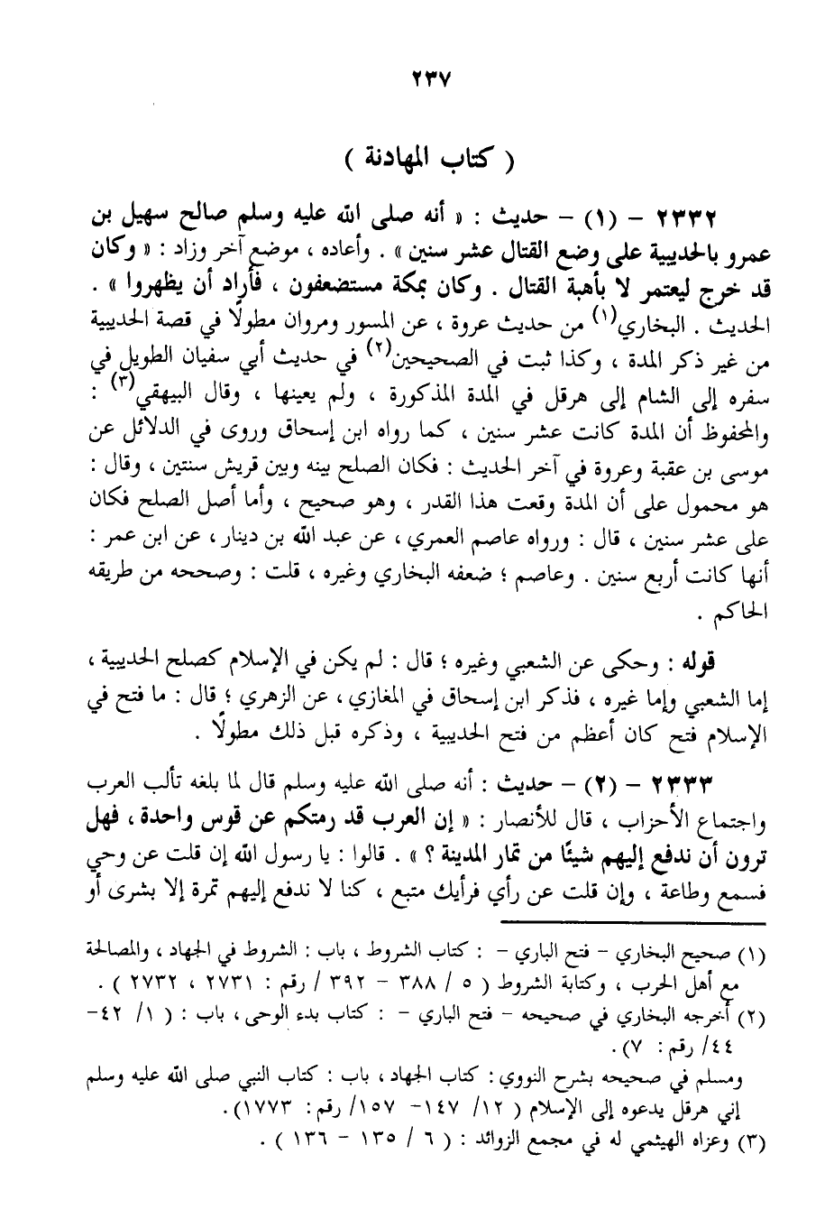 2332 - (1) - حَدِيثُ: «أَنَّهُ - صَلَّى اللَّهُ عَلَيْهِ وَسَلَّمَ - صَالَحَ سُهَيْلَ بْنَ عَمْرٍو بِالْحُدَيْبِيَةِ عَلَى وَضْعِ الْقِتَالِ عَشْرَ سِنِينَ» . وَأَعَادَهُ، مَوْضِعٌ آخَرُ وَزَادَ: «وَكَانَ قَدْ خَرَجَ لِيَعْتَمِرَ لَا بِأُهْبَةِ الْقِتَالِ. وَكَانَ بِمَكَّةَ مُسْتَضْعَفُونَ، فَأَرَادَ أَنْ يَظْهَرُوا» الْحَدِيثَ. الْبُخَارِيُّ مِنْ حَدِيثِ عُرْوَةَ، عَنْ الْمِسْوَرِ وَمَرْوَانَ مُطَوَّلًا فِي قِصَّةِ الْحُدَيْبِيَةِ مِنْ غَيْرِ ذِكْرِ الْمُدَّةِ، وَكَذَا ثَبَتَ فِي الصَّحِيحَيْنِ فِي حَدِيثِ أَبِي سُفْيَانَ الطَّوِيلِ فِي سَفَرِهِ إلَى الشَّامِ إلَى هِرَقْلَ فِي الْمُدَّةِ الْمَذْكُورَةِ، وَلَمْ يُعَيِّنْهَا، وَقَالَ الْبَيْهَقِيُّ: وَالْمَحْفُوظُ أَنَّ الْمُدَّةَ كَانَتْ عَشْرَ سِنِينَ، كَمَا رَوَاهُ ابْنُ إِسْحَاقَ وَرَوَى فِي الدَّلَائِلِ عَنْ مُوسَى بْنِ عُقْبَةَ وَعُرْوَةَ فِي آخِرِ الْحَدِيثِ: فَكَانَ الصُّلْحُ بَيْنَهُ وَبَيْنَ قُرَيْشٍ سَنَتَيْنِ، وَقَالَ: هُوَ مَحْمُولٌ عَلَى أَنَّ الْمُدَّةَ وَقَعَتْ هَذَا الْقَدْرَ، وَهُوَ صَحِيحٌ، وَأَمَّا أَصْلُ الصُّلْحِ فَكَانَ عَلَى عَشْرِ سِنِينَ، قَالَ: وَرَوَاهُ عَاصِمٌ الْعُمَرِيُّ، عَنْ عَبْدِ اللَّهِ بْنِ دِينَارٍ، عَنْ ابْنِ عُمَرَ: أَنَّهَا كَانَتْ أَرْبَعَ سِنِينَ. وَعَاصِمٌ؛ ضَعَّفَهُ الْبُخَارِيُّ وَغَيْرُهُ، قُلْت: وَصَحَّحَهُ مِنْ طَرِيقِهِ الْحَاكِمُ. قَوْلُهُ: وَحَكَى عَنْ الشَّعْبِيِّ وَغَيْرِهِ؛ قَالَ: لَمْ يَكُنْ فِي الْإِسْلَامِ كَصُلْحِ الْحُدَيْبِيَةِ، إمَّا الشَّعْبِيُّ وَإِمَّا غَيْرُهُ، فَذَكَرَ ابْنُ إِسْحَاقَ فِي الْمَغَازِي، عَنْ الزُّهْرِيِّ؛ قَالَ: «مَا فُتِحَ فِي الْإِسْلَامِ فَتْحٌ كَانَ أَعْظَمَ مِنْ فَتْحِ الْحُدَيْبِيَةِ» ، وَذَكَرَهُ قَبْلَ ذَلِكَ مُطَوَّلًا.