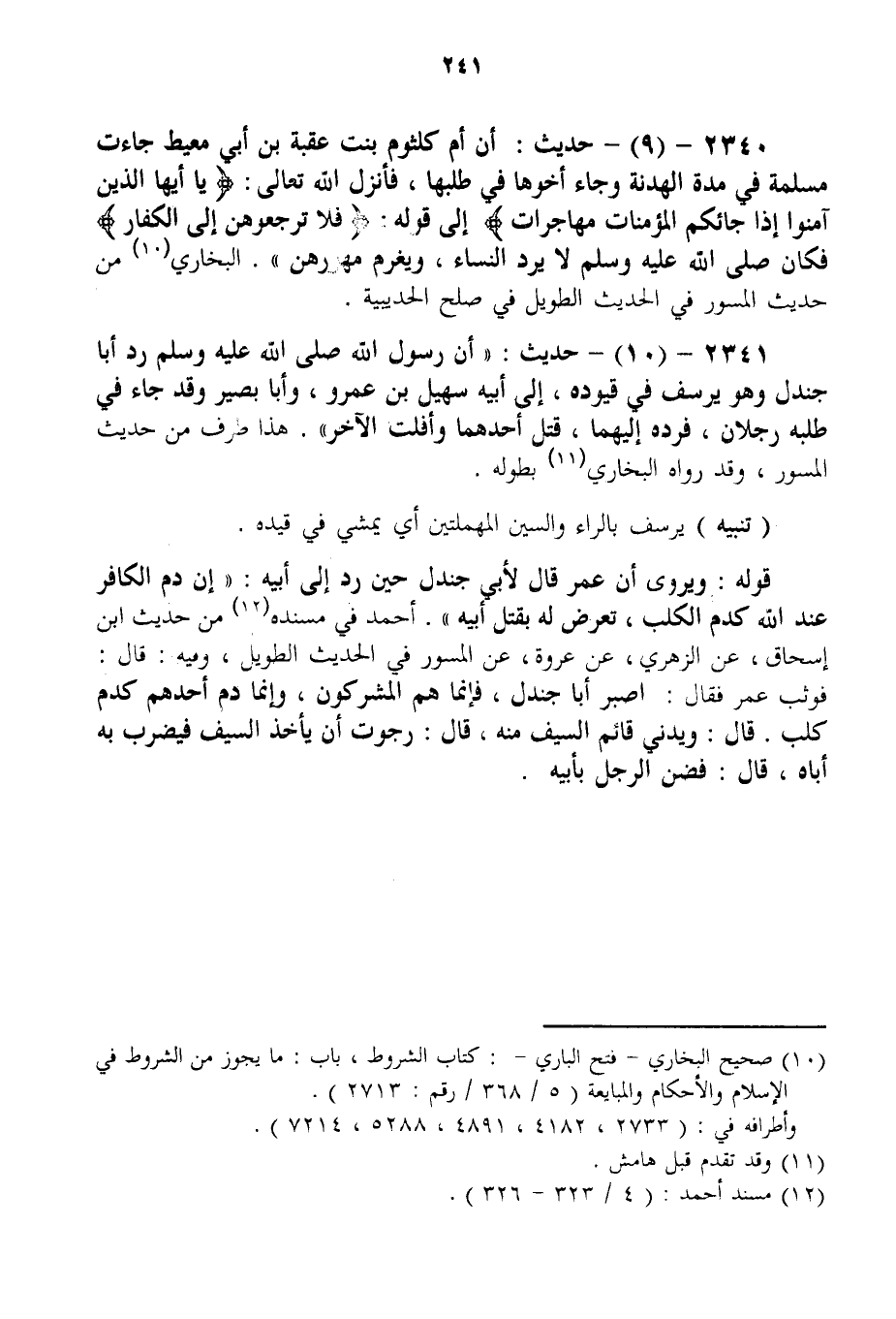 2341 - (10) - حَدِيثُ: «أَنَّ رَسُولَ اللَّهِ - صَلَّى اللَّهُ عَلَيْهِ وَسَلَّمَ - رَدَّ أَبَا جَنْدَلٍ وَهُوَ يَرْسُفُ فِي قُيُودِهِ، إلَى أَبِيهِ سُهَيْلِ بْنِ عَمْرٍو، وَأَبَا بَصِيرٍ وَقَدْ جَاءَ فِي طَلَبِهِ رَجُلَانِ، فَرَدَّهُ إلَيْهِمَا، قُتِلَ أَحَدُهُمَا وَأَفْلَتَ الْآخَرُ» . هَذَا طَرَفٌ مِنْ حَدِيثِ الْمِسْوَرِ، وَقَدْ رَوَاهُ الْبُخَارِيُّ بِطُولِهِ.