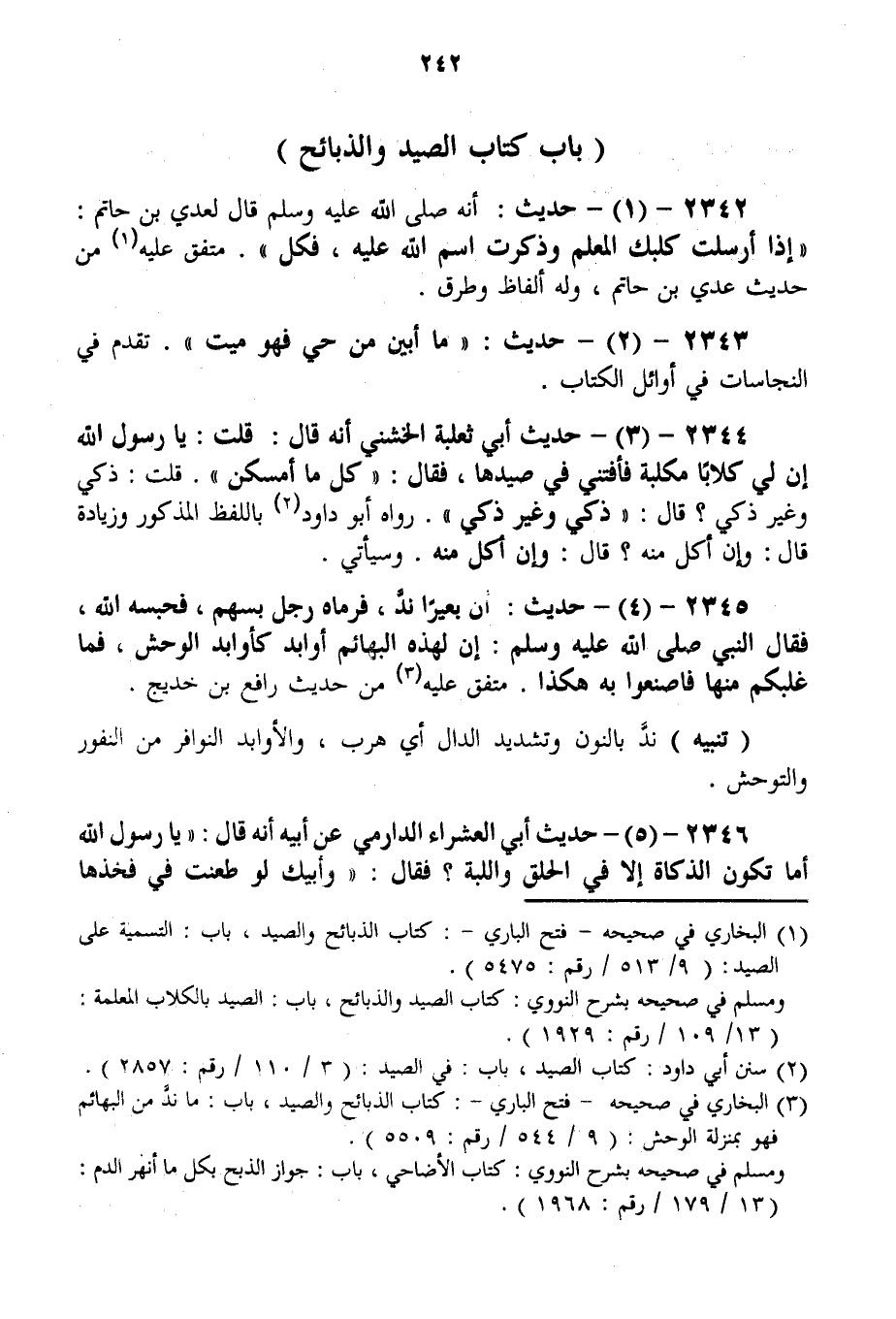 2342 - (1) - حَدِيثُ: «أَنَّهُ - صَلَّى اللَّهُ عَلَيْهِ وَسَلَّمَ - قَالَ لِعَدِيِّ بْنِ حَاتِمٍ: إذَا أَرْسَلْت كَلْبَك الْمُعَلَّمَ وَذَكَرْت اسْمَ اللَّهِ عَلَيْهِ، فَكُلْ» . مُتَّفَقٌ عَلَيْهِ مِنْ حَدِيثِ عَدِيِّ بْنِ حَاتِمٍ، وَلَهُ أَلْفَاظٌ وَطُرُقٌ.