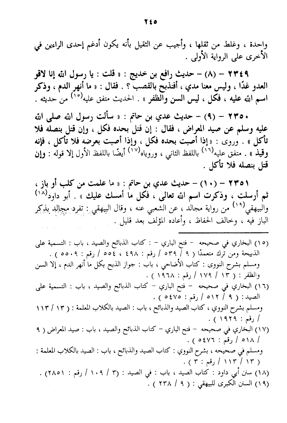 2350 - (9) - حَدِيثُ «عَدِيِّ بْنِ حَاتِمٍ: سَأَلْتُ رَسُولَ اللَّهِ - صَلَّى اللَّهُ عَلَيْهِ وَسَلَّمَ - عَنْ صَيْدِ الْمِعْرَاضِ، فَقَالَ: إنْ قَتَلَ بِحَدِّهِ فَكُلْ، وَإِنْ قَتَلَ بِنَصْلِهِ فَلَا تَأْكُلْ» . وَرُوِيَ: «إذَا أَصَبْت بِحَدِّهِ فَكُلْ، وَإِذَا أَصَبْت بِعَرْضِهِ فَلَا تَأْكُلْ، فَإِنَّهُ وَقِيذٌ» . مُتَّفَقٌ عَلَيْهِ بِاللَّفْظِ الثَّانِي، وَرَوَيَاهُ أَيْضًا بِاللَّفْظِ الْأَوَّلِ إلَّا قَوْلَهُ: وَإِنْ قَتَلَ بِنَصْلِهِ فَلَا تَأْكُلْ.
