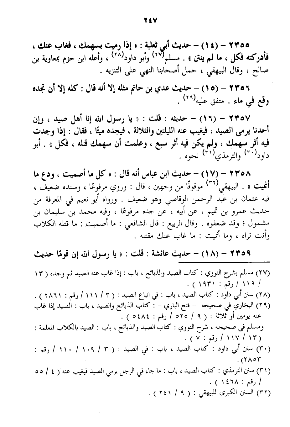 2357 - (16) - حَدِيثُهُ: قُلْت: «يَا رَسُولَ اللَّهِ إنَّا أَهْلُ صَيْدٍ، وَإِنَّ أَحَدَنَا يَرْمِي الصَّيْدَ، فَيَغِيبُ عَنْهُ اللَّيْلَتَيْنِ وَالثَّلَاثَةَ، فَيَجِدُهُ مَيِّتًا، فَقَالَ: إذَا وَجَدْت فِيهِ أَثَرَ سَهْمِك، وَلَمْ يَكُنْ فِيهِ أَثَرُ سَبُعٍ، وَعَلِمْت أَنَّ سَهْمَك قَتَلَهُ، فَكُلْ» . أَبُو دَاوُد وَالتِّرْمِذِيُّ نَحْوَهُ.