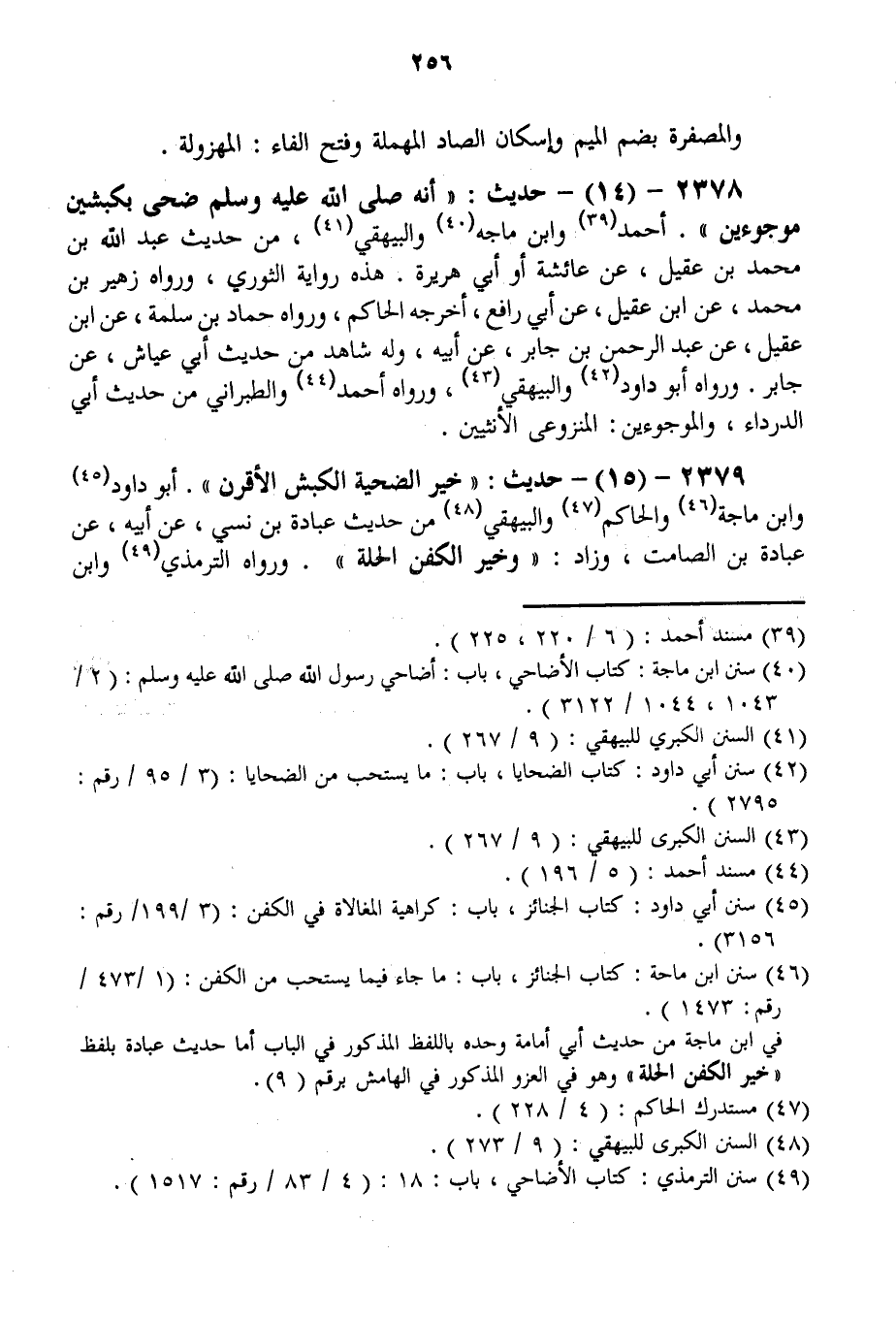 2378 - (14) - حَدِيثُ: «أَنَّهُ - صَلَّى اللَّهُ عَلَيْهِ وَسَلَّمَ - ضَحَّى بِكَبْشَيْنِ مَوْجُوءَيْنِ» . أَحْمَدُ وَابْنُ مَاجَهْ وَالْبَيْهَقِيُّ، مِنْ حَدِيثِ عَبْدِ اللَّهِ بْنِ مُحَمَّدِ بْنِ عَقِيلٍ، عَنْ عَائِشَةَ أَوْ أَبِي هُرَيْرَةَ. هَذِهِ رِوَايَةُ الثَّوْرِيِّ، وَرَوَاهُ زُهَيْرُ بْنُ مُحَمَّدٍ، عَنْ ابْنِ عَقِيلٍ، عَنْ أَبِي رَافِعٍ، أَخْرَجَهُ الْحَاكِمُ، وَرَوَاهُ حَمَّادُ بْنُ سَلَمَةَ، عَنْ ابْنِ عَقِيلٍ، عَنْ عَبْدِ الرَّحْمَنِ بْنِ جَابِرٍ، عَنْ أَبِيهِ، وَلَهُ شَاهِدٌ مِنْ حَدِيثِ أَبِي عَيَّاشٍ، عَنْ جَابِرٍ. وَرَوَاهُ أَبُو دَاوُد وَالْبَيْهَقِيُّ، وَرَوَاهُ أَحْمَدُ وَالطَّبَرَانِيُّ مِنْ حَدِيثِ أَبِي الدَّرْدَاءَ، وَالْمَوْجُوءَيْنِ الْمَنْزُوعَيْ الْأُنْثَيَيْنِ