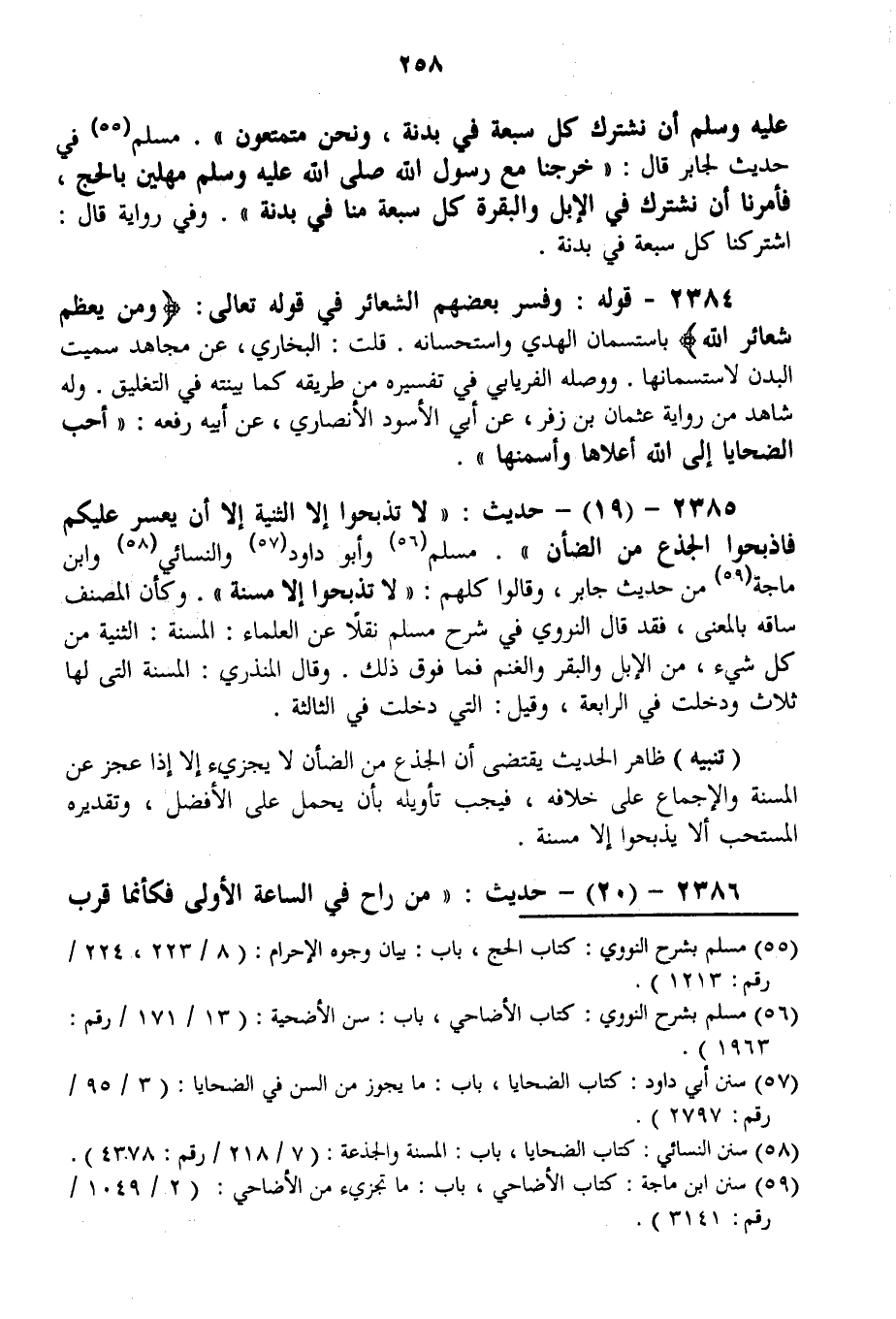 . 2385 - (19) - حَدِيثُ: «لَا تَذْبَحُوا إلَّا الثَّنِيَّةَ إلَّا أَنْ يَعْسُرَ عَلَيْكُمْ فَاذْبَحُوا الْجَذَعَ مِنْ الضَّأْنِ» . مُسْلِمٌ وَأَبُو دَاوُد وَالنَّسَائِيُّ وَابْنُ مَاجَهْ مِنْ حَدِيثِ جَابِرٍ، وَقَالُوا كُلُّهُمْ: «لَا تَذْبَحُوا إلَّا مُسِنَّةً» وَكَأَنَّ الْمُصَنَّفَ سَاقَهُ بِالْمَعْنَى، فَقَدْ قَالَ النَّوَوِيُّ فِي شَرْحِ مُسْلِمٍ نَقْلًا عَنْ الْعُلَمَاءِ: الْمُسِنَّةُ الثَّنِيَّةُ مِنْ كُلِّ شَيْءٍ مِنْ الْإِبِلِ وَالْبَقَرِ وَالْغَنَمِ فَمَا فَوْقَ ذَلِكَ وَقَالَ الْمُنْذِرِيُّ الْمُسِنَّةُ الَّتِي لَهَا ثَلَاثٌ وَدَخَلَتْ فِي الرَّابِعَةِ وَقِيلَ الَّتِي دَخَلَتْ فِي الثَّالِثَةِ.