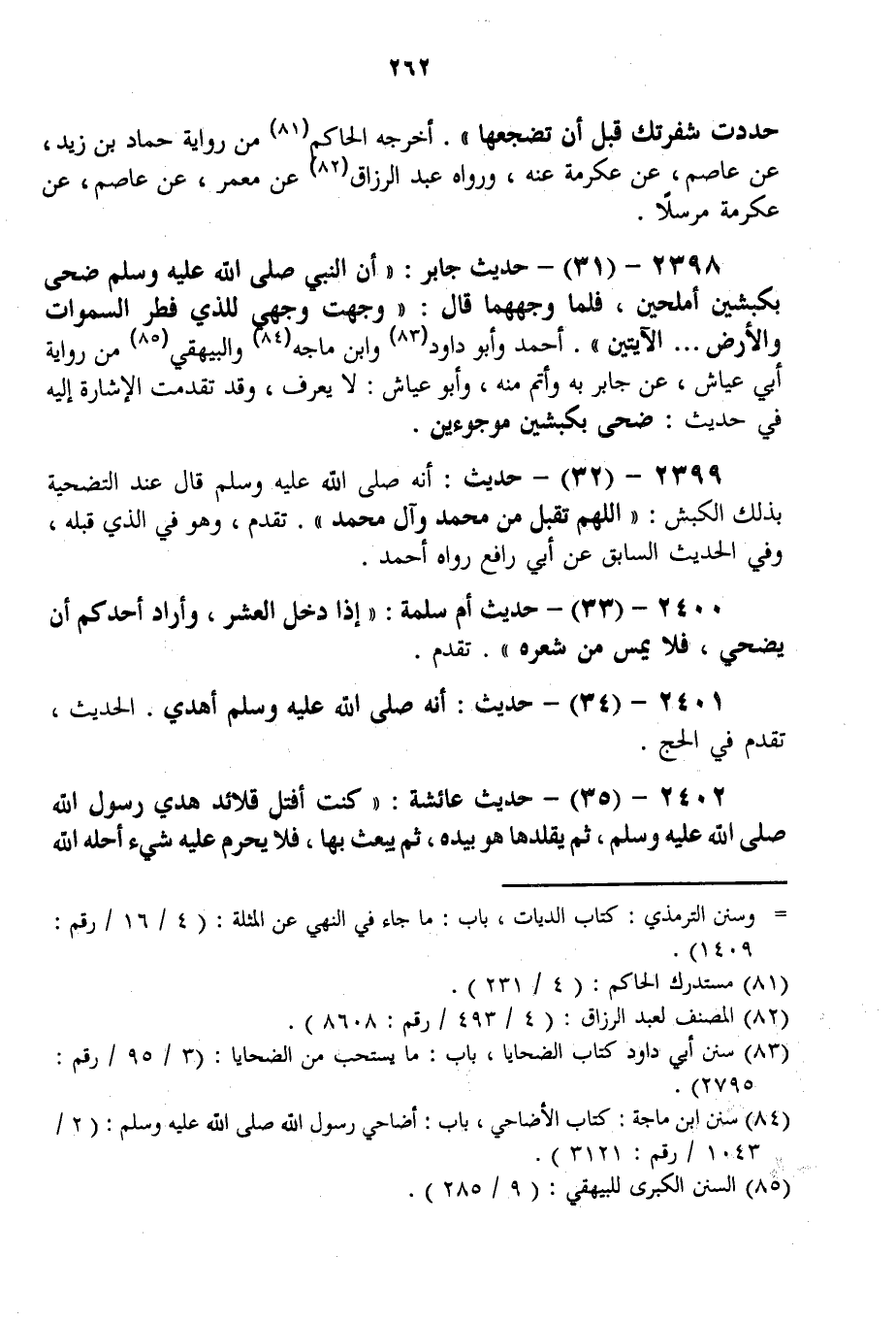 2398 - (31) - حَدِيثُ جَابِرٍ: «أَنَّ النَّبِيَّ - صَلَّى اللَّهُ عَلَيْهِ وَسَلَّمَ - ضَحَّى بِكَبْشَيْنِ أَمْلَحَيْنِ، فَلَمَّا وَجَّهَهُمَا قَالَ: {وَجَّهْتُ وَجْهِيَ لِلَّذِي فَطَرَ السَّمَاوَاتِ وَالأَرْضَ} [الأنعام: 79] . . . الْآيَتَيْنِ» . أَحْمَدُ وَأَبُو دَاوُد وَابْنُ مَاجَهْ وَالْبَيْهَقِيُّ مِنْ رِوَايَةِ أَبِي عَيَّاشٍ، عَنْ جَابِرٍ بِهِ وَأَتَمَّ مِنْهُ، وَأَبُو عَيَّاشٍ: لَا يُعْرَفُ، وَقَدْ تَقَدَّمَتْ الْإِشَارَةُ إلَيْهِ فِي حَدِيثِ: «ضَحَّى بِكَبْشَيْنِ مَوْجُوءَيْنِ» . 2399 - (32) - حَدِيثُ: «أَنَّهُ - صَلَّى اللَّهُ عَلَيْهِ وَسَلَّمَ - قَالَ عِنْدَ التَّضْحِيَةِ بِذَلِكَ الْكَبْشِ: اللَّهُمَّ تَقَبَّلْ مِنْ مُحَمَّدٍ وَآلِ مُحَمَّدٍ» . تَقَدَّمَ وَهُوَ فِي الَّذِي قَبْلَهُ، وَفِي الْحَدِيثِ السَّابِقِ عَنْ أَبِي رَافِعٍ رَوَاهُ أَحْمَدُ.