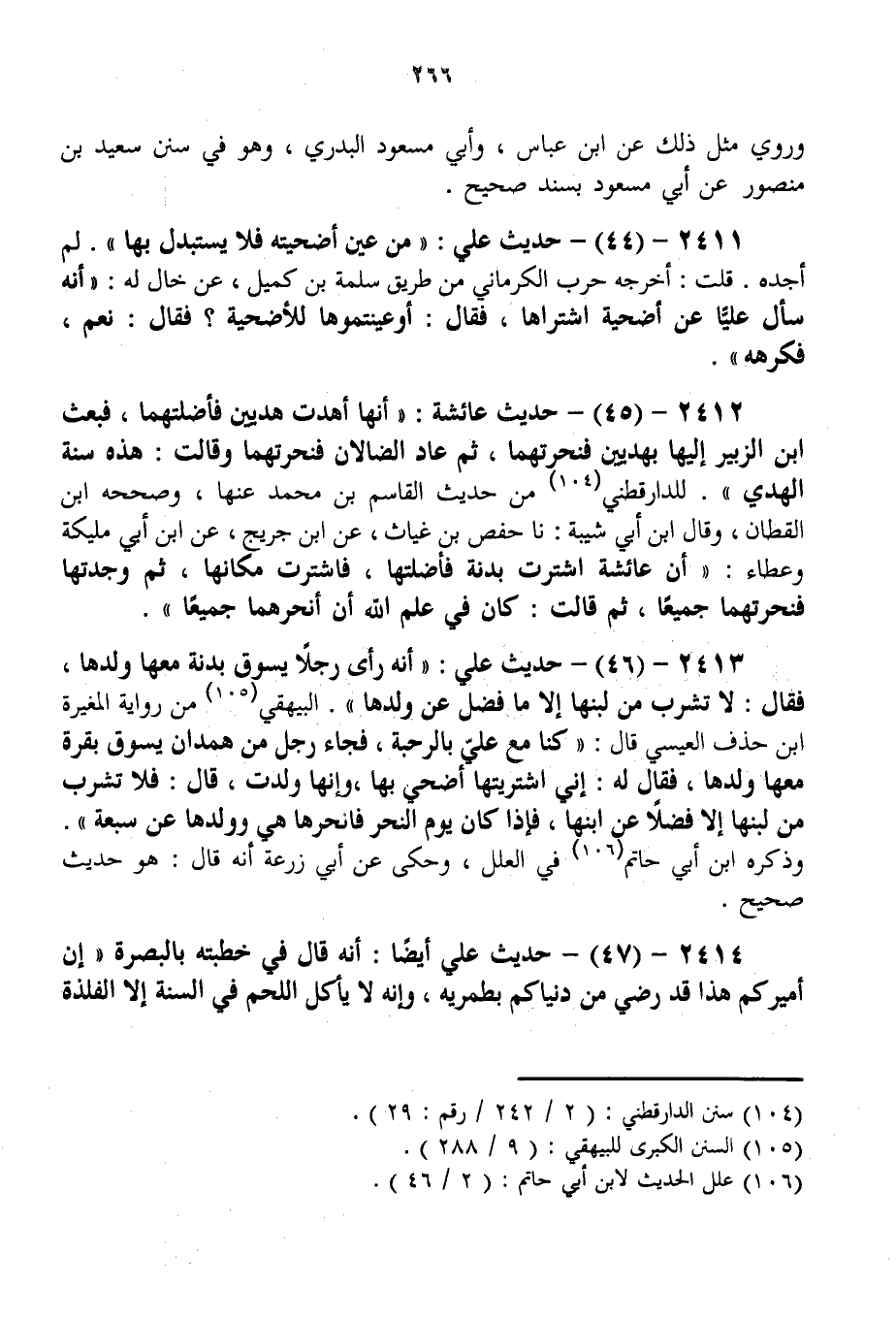 2413 - (46) - حَدِيثُ عَلِيٍّ: " أَنَّهُ رَأَى رَجُلًا يَسُوقُ بَدَنَةً مَعَهَا وَلَدُهَا، فَقَالَ: لَا تَشْرَبْ مِنْ لَبَنِهَا إلَّا مَا فَضَلَ عَنْ وَلَدِهَا ". الْبَيْهَقِيُّ مِنْ رِوَايَةِ الْمُغِيرَةِ بْنِ حُذَفٍ الْعِيسِيِّ قَالَ: " كُنَّا مَعَ عَلِيٍّ بِالرَّحْبَةِ، فَجَاءَ رَجُلٌ مِنْ هَمْدَانَ يَسُوقُ بَقَرَةً مَعَهَا وَلَدُهَا، فَقَالَ لَهُ: إنِّي اشْتَرَيْتهَا أُضَحِّي بِهَا، وَإِنَّهَا وَلَدَتْ، قَالَ: فَلَا تَشْرَبْ مِنْ لَبَنِهَا إلَّا فَضْلًا عَنْ ابْنِهَا، فَإِذَا كَانَ يَوْمُ النَّحْرِ فَانْحَرْهَا هِيَ وَوَلَدَهَا عَنْ سَبْعَةٍ ". وَذَكَرَهُ ابْنُ أَبِي حَاتِمٍ فِي الْعِلَلِ، وَحُكِيَ عَنْ أَبِي زُرْعَةَ أَنَّهُ قَالَ: هُوَ حَدِيثٌ صَحِيحٌ.