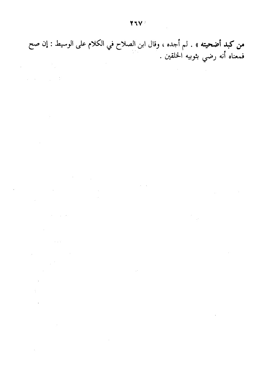 مِنْ كَبِدِ أُضْحِيَّتِهِ ". لَمْ أَجِدْهُ، وَقَالَ ابْنُ الصَّلَاحِ فِي الْكَلَامِ عَلَى الْوَسِيطِ: إنْ صَحَّ فَمَعْنَاهُ أَنَّهُ رَضِيَ بِثَوْبَيْهِ الْخَلِقَيْنِ.
