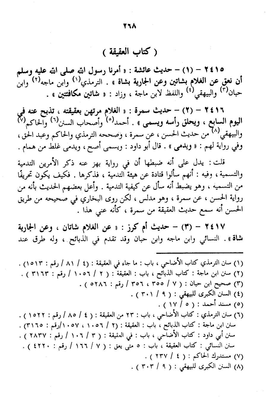 2415 - (1) - حَدِيثُ عَائِشَةَ: «أَمَرَنَا رَسُولُ اللَّهِ - صَلَّى اللَّهُ عَلَيْهِ وَسَلَّمَ - أَنْ نَعُقَّ عَنْ الْغُلَامِ بِشَاتَيْنِ وَعَنْ الْجَارِيَةِ بِشَاةٍ» . التِّرْمِذِيُّ وَابْنُ مَاجَهْ وَابْنُ حِبَّانَ وَالْبَيْهَقِيُّ وَاللَّفْظُ لِابْنِ مَاجَهْ، وَزَادَ: «شَاتَيْنِ مُكَافِئَتَيْنِ» .