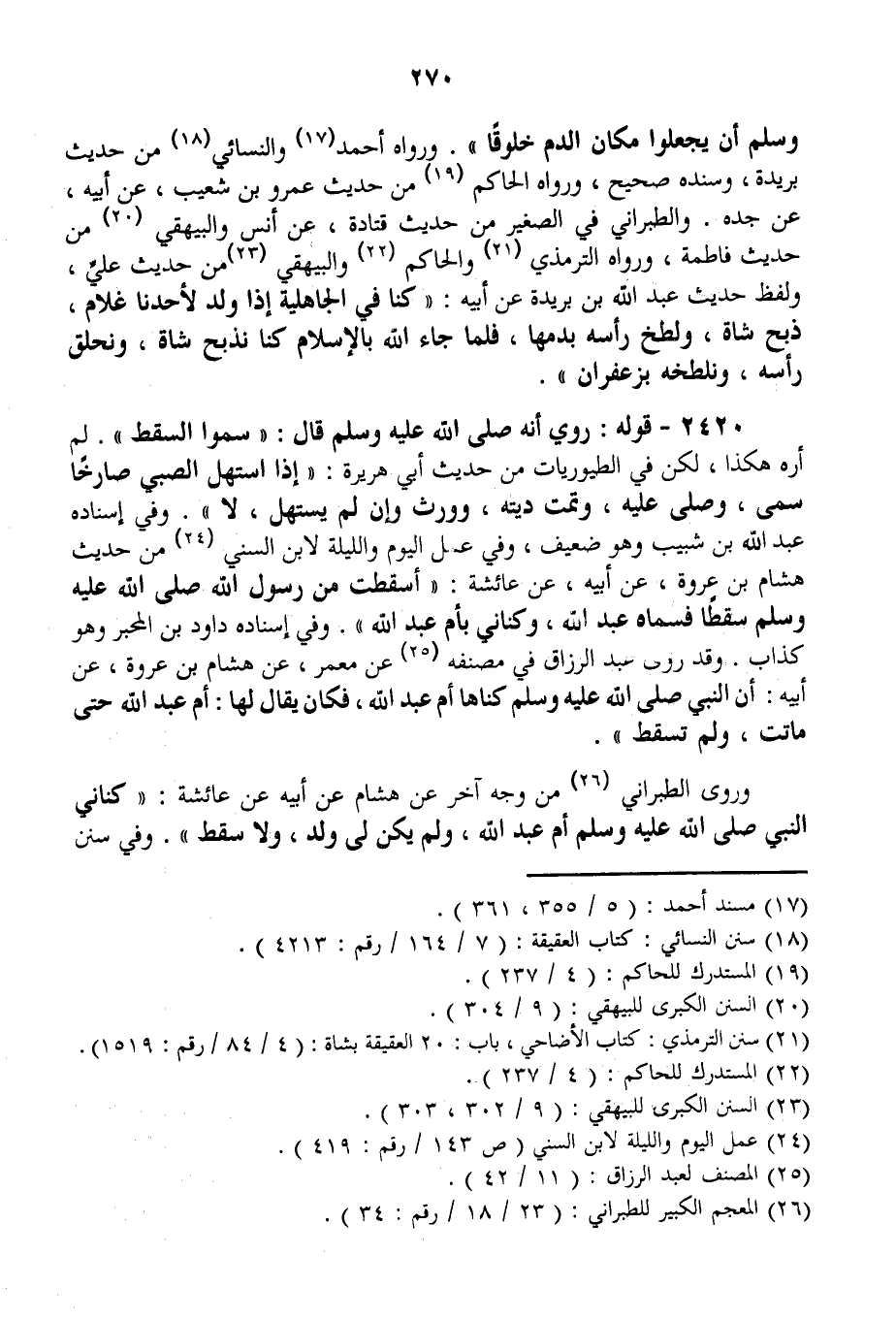 أَنْ يَجْعَلُوا مَكَانَ الدَّمِ خَلُوقًا» . وَرَوَاهُ أَحْمَدُ وَالنَّسَائِيُّ مِنْ حَدِيثِ بُرَيْدَةَ، وَسَنَدُهُ صَحِيحٌ، وَرَوَاهُ الْحَاكِمُ مِنْ حَدِيثِ عَمْرِو بْنِ شُعَيْبٍ، عَنْ أَبِيهِ، عَنْ جَدِّهِ. وَالطَّبَرَانِيُّ فِي الصَّغِيرِ مِنْ حَدِيثِ قَتَادَةَ، عَنْ أَنَسٍ وَالْبَيْهَقِيُّ مِنْ حَدِيثِ فَاطِمَةَ، وَرَوَاهُ التِّرْمِذِيُّ وَالْحَاكِمُ وَالْبَيْهَقِيُّ مِنْ حَدِيثِ عَلِيٍّ، وَلَفْظُ حَدِيثِ عَبْدِ اللَّهِ بْنِ بُرَيْدَةَ عَنْ أَبِيهِ: «كُنَّا فِي الْجَاهِلِيَّةِ إذَا وُلِدَ لِأَحَدِنَا غُلَامٌ، ذَبَحَ شَاةً، وَلَطَّخَ رَأْسَهُ بِدَمِهَا، فَلَمَّا جَاءَ اللَّهُ بِالْإِسْلَامِ كُنَّا نَذْبَحُ شَاةً، وَنَحْلِقُ رَأْسَهُ، وَنُلَطِّخُهُ بِزَعْفَرَانٍ» .
