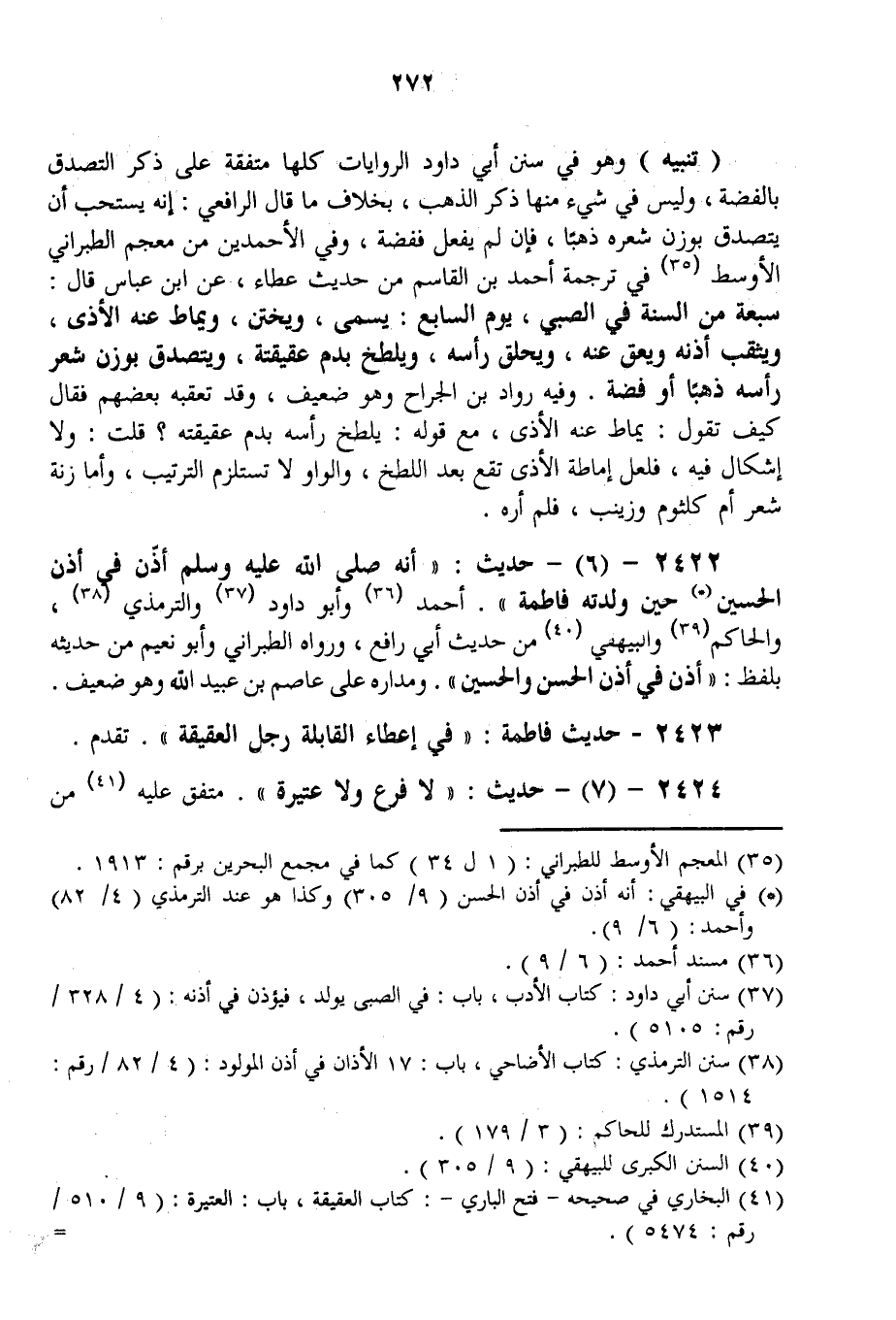 وَهُوَ فِي سُنَنِ أَبِي دَاوُد الرِّوَايَاتُ كُلُّهَا مُتَّفِقَةٌ عَلَى ذِكْرِ التَّصَدُّقِ بِالْفِضَّةِ، وَلَيْسَ فِي شَيْءٍ مِنْهَا ذِكْرُ الذَّهَبِ، بِخِلَافِ مَا قَالَ الرَّافِعِيُّ: إنَّهُ يُسْتَحَبُّ أَنْ يُتَصَدَّقَ بِوَزْنِ شَعْرِهِ ذَهَبًا، فَإِنْ لَمْ يَفْعَلْ فَفِضَّةً، وَفِي الْأَحْمَدِينَ مِنْ مُعْجَمِ الطَّبَرَانِيِّ الْأَوْسَطِ فِي تَرْجَمَةِ أَحْمَدَ بْنِ الْقَاسِمِ مِنْ حَدِيثِ عَطَاءٍ، عَنْ ابْنِ عَبَّاسٍ قَالَ: سَبْعَةٌ مِنْ السُّنَّةِ فِي الصَّبِيِّ، يَوْمَ السَّابِعِ: يُسَمَّى، وَيُخْتَنُ، وَيُمَاطُ عَنْهُ الْأَذَى، وَيُثْقَبُ أُذُنُهُ وَيُعَقُّ عَنْهُ، وَيُحْلَقُ رَأْسُهُ، وَيُلَطَّخُ بِدَمِ عَقِيقَتِهِ، وَيُتَصَدَّقُ بِوَزْنِ شَعْرِ رَأْسِهِ ذَهَبَا أَوْ فِضَّةً. وَفِيهِ رُوَّادُ بْنُ الْجَرَّاحِ وَهُوَ ضَعِيفٌ، وَقَدْ تَعَقَّبَهُ بَعْضُهُمْ فَقَالَ كَيْفَ تَقُولُ: يُمَاطُ عَنْهُ الْأَذَى، مَعَ قَوْلِهِ: يُلَطَّخُ رَأْسُهُ بِدَمِ عَقِيقَتِهِ؟ قُلْت: وَلَا إشْكَالَ فِيهِ، فَلَعَلَّ إمَاطَةَ الْأَذَى تَقَعُ بَعْدَ اللَّطْخِ، وَالْوَاوُ لَا تَسْتَلْزِمُ التَّرْتِيبَ، وَأَمَّا زِنَةُ شَعْرِ أُمِّ كُلْثُومَ وَزَيْنَبَ، فَلَمْ أَرَهُ.
