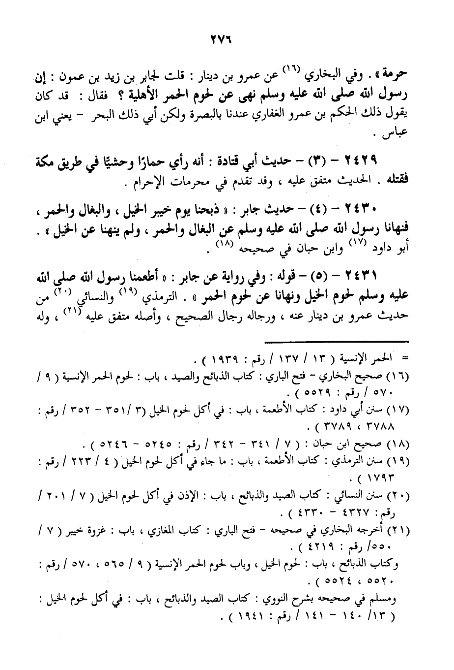 2430 - (4) - حَدِيثُ جَابِرٍ: «ذَبَحْنَا يَوْمَ خَيْبَرَ الْخَيْلَ، وَالْبِغَالَ وَالْحُمُرَ، فَنَهَانَا رَسُولُ اللَّهِ - صَلَّى اللَّهُ عَلَيْهِ وَسَلَّمَ - عَنْ الْبِغَالِ وَالْحُمَرِ، وَلَمْ يَنْهَنَا عَنْ الْخَيْلِ» . أَبُو دَاوُد وَابْنُ حِبَّانَ فِي صَحِيحِهِ.