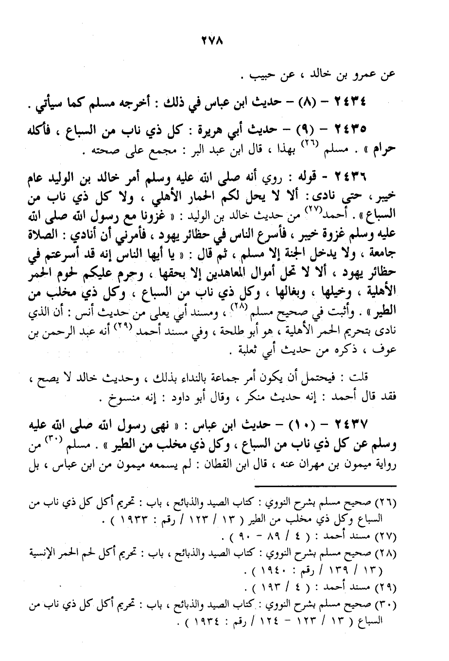 2436 - قَوْلُهُ: رُوِيَ «أَنَّهُ - صَلَّى اللَّهُ عَلَيْهِ وَسَلَّمَ - أَمَرَ خَالِدَ بْنَ الْوَلِيدِ عَامَ خَيْبَرَ، حَتَّى نَادَى: أَلَا لَا يَحِلُّ لَكُمْ الْحِمَارُ الْأَهْلِيُّ، وَلَا كُلُّ ذِي نَابٍ مِنْ السِّبَاعِ» . أَحْمَدُ مِنْ حَدِيثِ خَالِدِ بْنِ الْوَلِيدِ: «غَزَوْنَا مَعَ رَسُولِ اللَّهِ - صَلَّى اللَّهُ عَلَيْهِ وَسَلَّمَ - غَزْوَةَ خَيْبَرَ، فَأَسْرَعَ النَّاسُ فِي حَظَائِرِ يَهُودَ، فَأَمَرَنِي أَنْ أُنَادِيَ: الصَّلَاةُ جَامِعَةٌ، وَلَا يَدْخُلُ الْجَنَّةَ إلَّا مُسْلِمٌ، ثُمَّ قَالَ: يَا أَيُّهَا النَّاسُ إنَّهُ قَدْ أَسْرَعْتُمْ فِي حَظَائِرِ يَهُودَ، أَلَا لَا تَحِلُّ أَمْوَالُ الْمُعَاهَدِينَ إلَّا بِحَقِّهَا، وَحُرِّمَ عَلَيْكُمْ لُحُومُ الْحُمُرِ الْأَهْلِيَّةِ، وَخَيْلُهَا، وَبِغَالُهَا، وَكُلُّ ذِي نَابٍ مِنْ السِّبَاعِ، وَكُلُّ ذِي مِخْلَبٍ مِنْ الطَّيْرِ» .