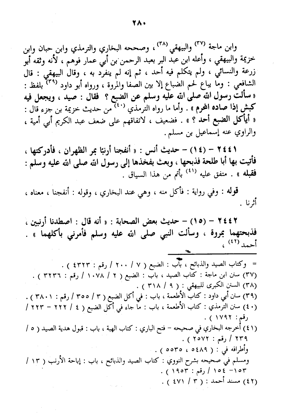 وَابْنُ مَاجَهْ وَالْبَيْهَقِيُّ، وَصَحَّحَهُ الْبُخَارِيُّ وَالتِّرْمِذِيُّ وَابْنُ حِبَّانَ وَابْنُ خُزَيْمَةَ وَالْبَيْهَقِيُّ، وَأَعَلَّهُ ابْنُ عَبْدِ الْبَرِّ بِعَبْدِ الرَّحْمَنِ بْنِ أَبِي عَمَّارٍ فَوَهِمَ، لِأَنَّهُ وَثَّقَهُ أَبُو زُرْعَةَ وَالنَّسَائِيُّ، وَلَمْ يَتَكَلَّمْ فِيهِ أَحَدٌ، ثُمَّ إنَّهُ لَمْ يَنْفَرِدْ بِهِ، وَقَالَ الْبَيْهَقِيُّ: قَالَ الشَّافِعِيُّ: وَمَا يُبَاعُ لَحْمُ الضِّبَاعِ إلَّا بَيْنَ الصَّفَّا وَالْمَرْوَةِ وَرَوَاهُ أَبُو دَاوُد بِلَفْظِ: «سَأَلْت رَسُولَ اللَّهِ - صَلَّى اللَّهُ عَلَيْهِ وَسَلَّمَ - عَنْ الضَّبُعِ؟ فَقَالَ: صَيْدٌ، وَيُجْعَلُ فِيهِ كَبْشٌ إذَا صَادَهُ الْمُحْرِمُ» . وَأَمَّا مَا رَوَاهُ التِّرْمِذِيُّ مِنْ حَدِيثِ خُزَيْمَةَ بْنِ جُزْءٍ قَالَ: «أَيَأْكُلُ الضَّبُعَ أَحَدٌ؟» . فَضَعِيفٌ، لِاتِّفَاقِهِمْ عَلَى ضَعْفِ عَبْدِ الْكَرِيمِ أَبِي أُمَيَّةَ، وَالرَّاوِي عَنْهُ إسْمَاعِيلُ بْنُ مُسْلِمٍ.
