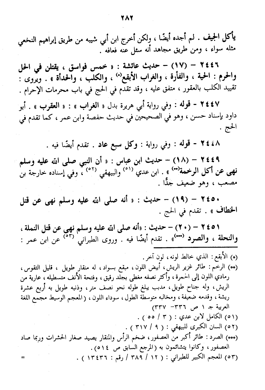2449 - (18) - حَدِيثُ ابْنِ عَبَّاسٍ: «أَنَّ النَّبِيَّ - صَلَّى اللَّهُ عَلَيْهِ وَسَلَّمَ - نَهَى عَنْ أَكْلِ الرَّخَمَةِ» . ابْنُ عَدِيٍّ وَالْبَيْهَقِيُّ وَفِي إسْنَادِهِ خَارِجَةُ بْنُ مُصْعَبٍ، وَهُوَ ضَعِيفٌ جِدًّا.