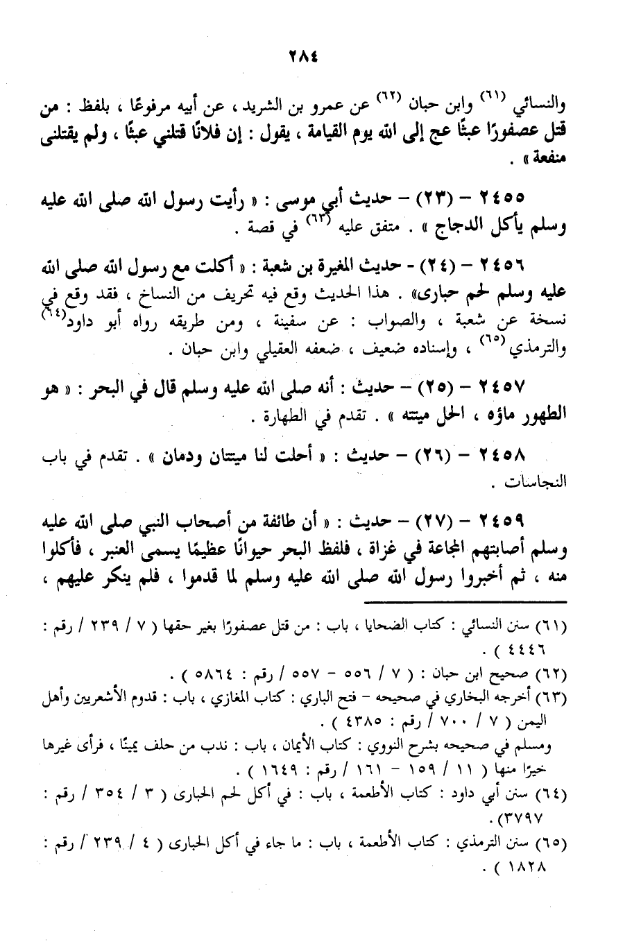 2456 - (24) - حَدِيثُ الْمُغِيرَةِ بْنِ شُعْبَةَ: «أَكَلْت مَعَ رَسُولِ اللَّهِ - صَلَّى اللَّهُ عَلَيْهِ وَسَلَّمَ - لَحْمَ حُبَارَى» . هَذَا الْحَدِيثُ وَقَعَ فِيهِ تَحْرِيفٌ مِنْ النُّسَّاخِ، فَقَدْ وَقَعَ فِي نُسْخَةٍ عَنْ شُعْبَةَ، وَالصَّوَابُ: عَنْ سَفِينَةَ، وَمِنْ طَرِيقِهِ رَوَاهُ أَبُو دَاوُد وَالتِّرْمِذِيُّ وَإِسْنَادُهُ ضَعِيفٌ، ضَعَّفَهُ الْعُقَيْلِيُّ وَابْنُ حِبَّانَ. 2457 - (25) - حَدِيثُ: أَنَّهُ - صَلَّى اللَّهُ عَلَيْهِ وَسَلَّمَ - قَالَ فِي الْبَحْرِ: «هُوَ الطَّهُورُ مَاؤُهُ، الْحِلُّ مَيْتَتُهُ» . تَقَدَّمَ فِي الطَّهَارَةِ.