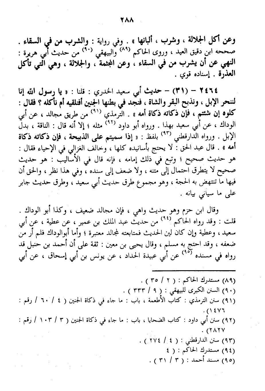 2464 - (31) - حَدِيثُ أَبِي سَعِيدٍ الْخُدْرِيِّ: قُلْنَا: «يَا رَسُولَ اللَّهِ إنَّا لَنَنْحَرُ الْإِبِلَ، وَنَذْبَحُ الْبَقَرَ وَالشَّاةَ، فَنَجِدُ فِي بَطْنِهَا الْجَنِينَ أَفَنُلْقِيه أَمْ نَأْكُلُهُ؟ فَقَالَ: كُلُوهُ إنْ شِئْتُمْ، فَإِنَّ ذَكَاتَهُ ذَكَاةُ أُمِّهِ» . التِّرْمِذِيُّ مِنْ طَرِيقِ مُجَالِدٍ، عَنْ أَبِي الْوَدَّاكِ، عَنْ أَبِي سَعِيدٍ بِهَذَا. وَرَوَاهُ أَبُو دَاوُد مِثْلَهُ؛ إلَّا أَنَّهُ قَالَ: النَّاقَةَ، بَدَلَ الْإِبِلِ. وَرَوَاهُ الدَّارَقُطْنِيُّ بِلَفْظِ: «إذَا سَمَّيْتُمْ عَلَى الذَّبِيحَةِ، فَإِنَّ ذَكَاتَهُ ذَكَاةُ أُمِّهِ» . قَالَ عَبْدُ الْحَقِّ: لَا يُحْتَجُّ بِأَسَانِيدِهِ كُلِّهَا، وَخَالَفَ الْغَزَالِيُّ فِي الْإِحْيَاءِ فَقَالَ: هُوَ حَدِيثٌ صَحِيحٌ؛ وَتَبِعَ فِي ذَلِكَ إمَامَهُ، فَإِنَّهُ قَالَ فِي الْأَسَالِيبِ: هُوَ حَدِيثٌ صَحِيحٌ لَا يَتَطَرَّقُ احْتِمَالٌ إلَى مَتْنِهِ، وَلَا ضَعْفٌ إلَى سَنَدِهِ، وَفِي هَذَا نَظَرٌ، وَالْحَقُّ أَنَّ فِيهَا مَا تَنْتَهِضُ بِهِ الْحُجَّةُ، وَهُوَ مَجْمُوعُ طُرُقِ حَدِيثِ أَبِي سَعِيدٍ، وَطُرُقِ حَدِيثِ جَابِرٍ عَلَى مَا سَيَأْتِي بَيَانُهُ. وَقَالَ ابْنُ حَزْمٍ وَهُوَ حَدِيثٌ وَاهٍ، فَإِنَّ مُجَالِدَ ضَعِيفٌ، وَكَذَا أَبُو الْوَدَّاكِ.