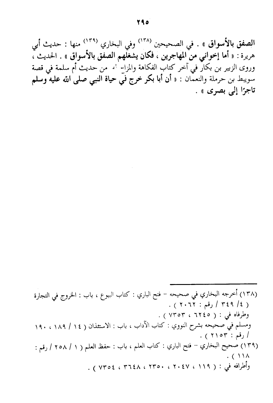 الصَّفْقُ بِالْأَسْوَاقِ ". فِي الصَّحِيحَيْنِ وَفِي الْبُخَارِيِّ مِنْهَا: حَدِيثُ أَبِي هُرَيْرَةَ: " أَمَّا إخْوَانِي مِنْ الْمُهَاجِرِينَ، فَكَانَ يَشْغَلُهُمْ الصَّفْقُ بِالْأَسْوَاقِ ". الْحَدِيثَ، وَرَوَى الزُّبَيْرُ بْنُ بَكَّارٍ فِي آخِرِ كِتَابِ الْفُكَاهَةِ وَالْمِزَاحِ لَهُ مِنْ حَدِيثِ أُمِّ سَلَمَةَ فِي قِصَّةِ سُوَيْبِطِ بْنِ حَرْمَلَةَ وَالنُّعْمَانِ: " أَنَّ أَبَا بَكْرٍ خَرَجَ فِي حَيَاةِ النَّبِيِّ - صَلَّى اللَّهُ عَلَيْهِ وَسَلَّمَ - تَاجِرًا إلَى بُصْرَى ".