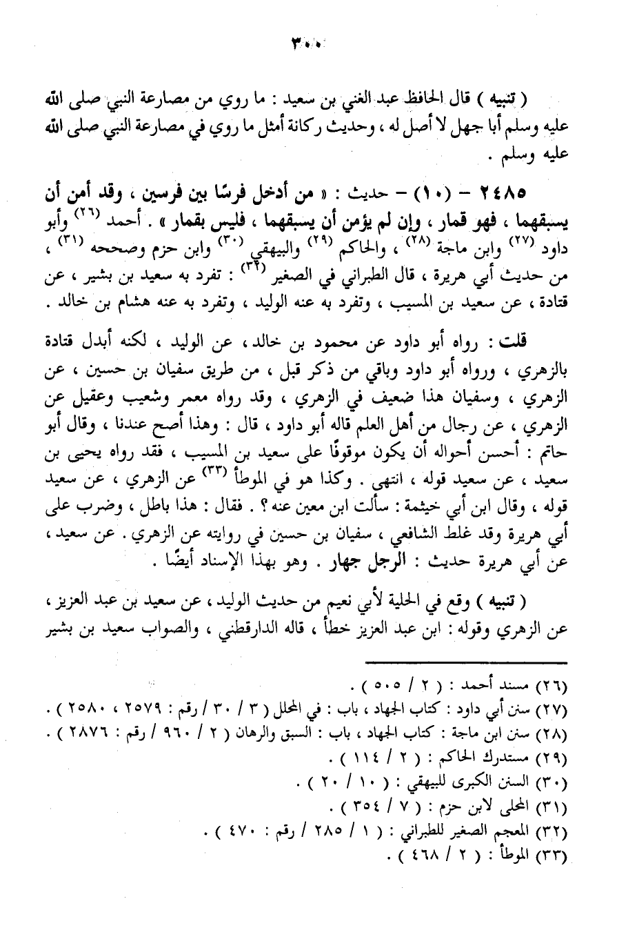 2485 - (10) - حَدِيثُ: «مَنْ أَدْخَلَ فَرَسًا بَيْنَ فَرَسَيْنِ، وَقَدْ أُمِنَ أَنْ يَسْبِقَهُمَا، فَهُوَ قِمَارٌ، وَإِنْ لَمْ يُؤْمَنْ أَنْ يَسْبِقَهُمَا، فَلَيْسَ بِقِمَارٍ» . أَحْمَدُ وَأَبُو دَاوُد وَابْنُ مَاجَهْ وَالْحَاكِمُ وَالْبَيْهَقِيُّ وَابْنُ حَزْمٍ وَصَحَّحَهُ، مِنْ حَدِيثِ أَبِي هُرَيْرَةَ، قَالَ الطَّبَرَانِيُّ فِي الصَّغِيرِ: تَفَرَّدَ بِهِ سَعِيدُ بْنُ بَشِيرٍ، عَنْ قَتَادَةَ، عَنْ سَعِيدِ بْنِ الْمُسَيِّبِ، وَتَفَرَّدَ بِهِ عَنْهُ الْوَلِيدُ، وَتَفَرَّدَ بِهِ عَنْهُ هِشَامُ بْنُ خَالِدٍ.