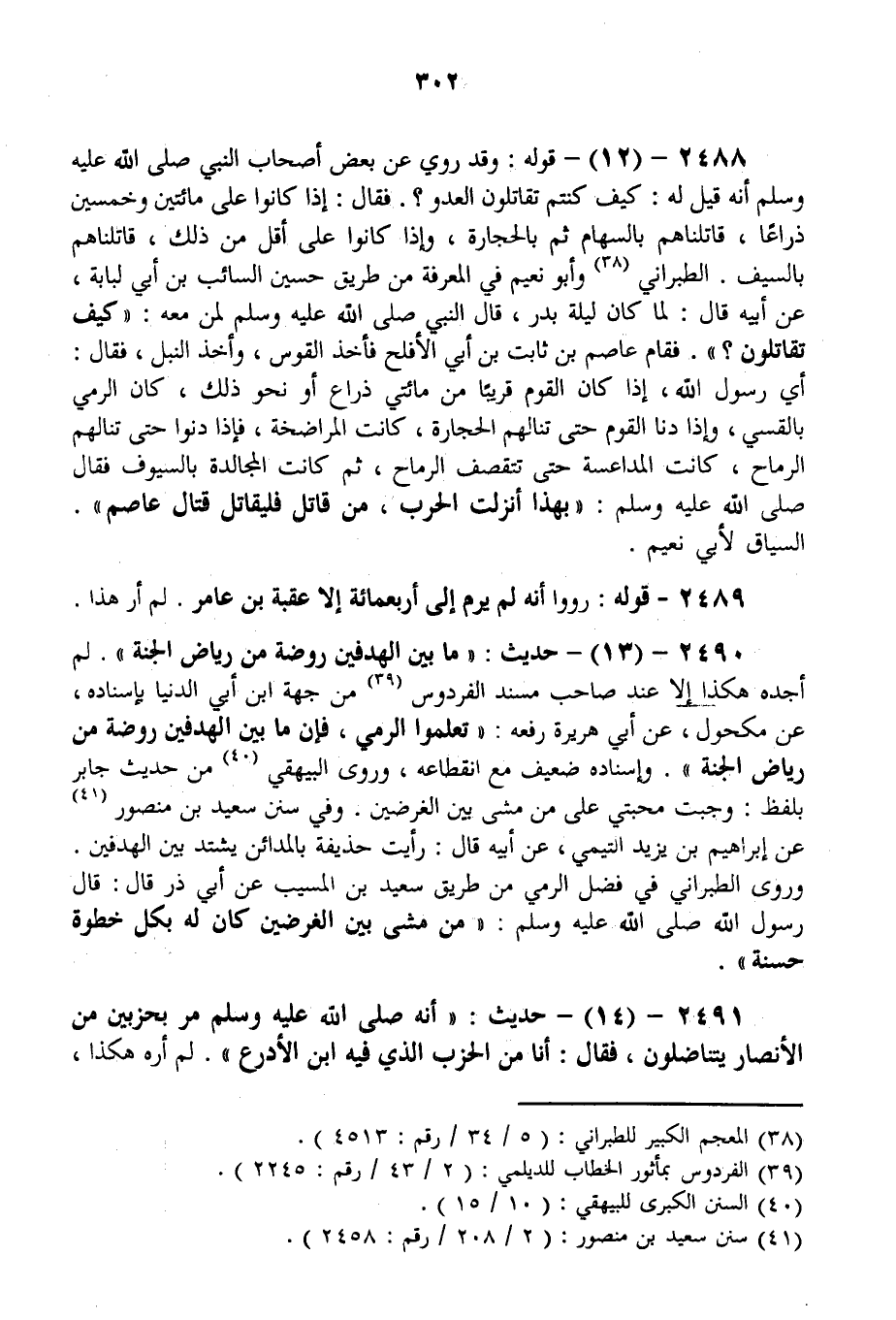 2490 - (13) - حَدِيثُ: «مَا بَيْنَ الْهَدَفَيْنِ رَوْضَةٌ مِنْ رِيَاضِ الْجَنَّةِ» . لَمْ أَجِدْهُ هَكَذَا إلَّا عِنْدَ صَاحِبِ مُسْنَدِ الْفِرْدَوْسِ مِنْ جِهَةِ ابْنِ أَبِي الدُّنْيَا بِإِسْنَادِهِ، عَنْ مَكْحُولٍ، عَنْ أَبِي هُرَيْرَةَ رَفَعَهُ: «تَعَلَّمُوا الرَّمْيَ، فَإِنَّ مَا بَيْنَ الْهَدَفَيْنِ رَوْضَةٌ مِنْ رِيَاضِ الْجَنَّةِ» . وَإِسْنَادُهُ ضَعِيفٌ مَعَ انْقِطَاعِهِ.