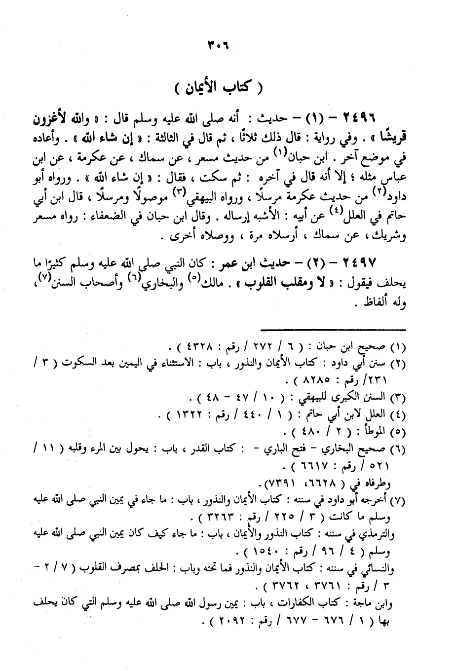 2497 - (2) - حَدِيثُ ابْنِ عُمَرَ: «كَانَ النَّبِيُّ - صَلَّى اللَّهُ عَلَيْهِ وَسَلَّمَ - كَثِيرًا مَا يَحْلِفُ فَيَقُولُ: لَا وَمُقَلِّبِ الْقُلُوبِ» مَالِكٌ وَالْبُخَارِيُّ وَأَصْحَابُ السُّنَنِ، وَلَهُ أَلْفَاظٌ.