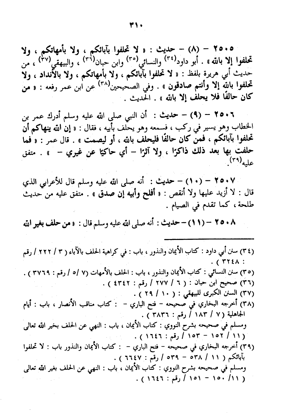 حَدِيثُ: «لَا تَحْلِفُوا بِآبَائِكُمْ، وَلَا بِأُمَّهَاتِكُمْ، وَلَا تَحْلِفُوا إلَّا بِاَللَّهِ» . أَبُو دَاوُد وَالنَّسَائِيُّ وَابْنُ حِبَّانَ، وَالْبَيْهَقِيُّ، مِنْ حَدِيثِ أَبِي هُرَيْرَةَ بِلَفْظِ: «لَا تَحْلِفُوا بِآبَائِكُمْ، وَلَا بِأُمَّهَاتِكُمْ، وَلَا بِالْأَنْدَادِ، وَلَا تَحْلِفُوا بِاَللَّهِ إلَّا وَأَنْتُمْ صَادِقُونَ» . وَفِي الصَّحِيحَيْنِ عَنْ ابْنِ عُمَرَ رَفَعَهُ: «مَنْ كَانَ حَالِفًا فَلَا يَحْلِفْ إلَّا بِاَللَّهِ» . الْحَدِيثُ. 2506 - (9) - حَدِيثُ: «أَنَّ النَّبِيَّ - صَلَّى اللَّهُ عَلَيْهِ وَسَلَّمَ - أَدْرَكَ عُمَرَ بْنَ الْخَطَّابِ وَهُوَ يَسِيرُ فِي رَكْبٍ، فَسَمِعَهُ وَهُوَ يَحْلِفُ بِأَبِيهِ، فَقَالَ: إنَّ اللَّهَ يَنْهَاكُمْ أَنْ تَحْلِفُوا بِآبَائِكُمْ، فَمَنْ كَانَ حَالِفًا فَلْيَحْلِفْ بِاَللَّهِ، أَوْ لِيَصْمُتْ. قَالَ عُمَرُ: فَمَا حَلَفْت بِهَا بَعْدَ ذَلِكَ ذَاكِرًا، وَلَا آثِرًا - أَيْ حَاكِيًا عَنْ غَيْرِي -» . مُتَّفَقٌ عَلَيْهِ.