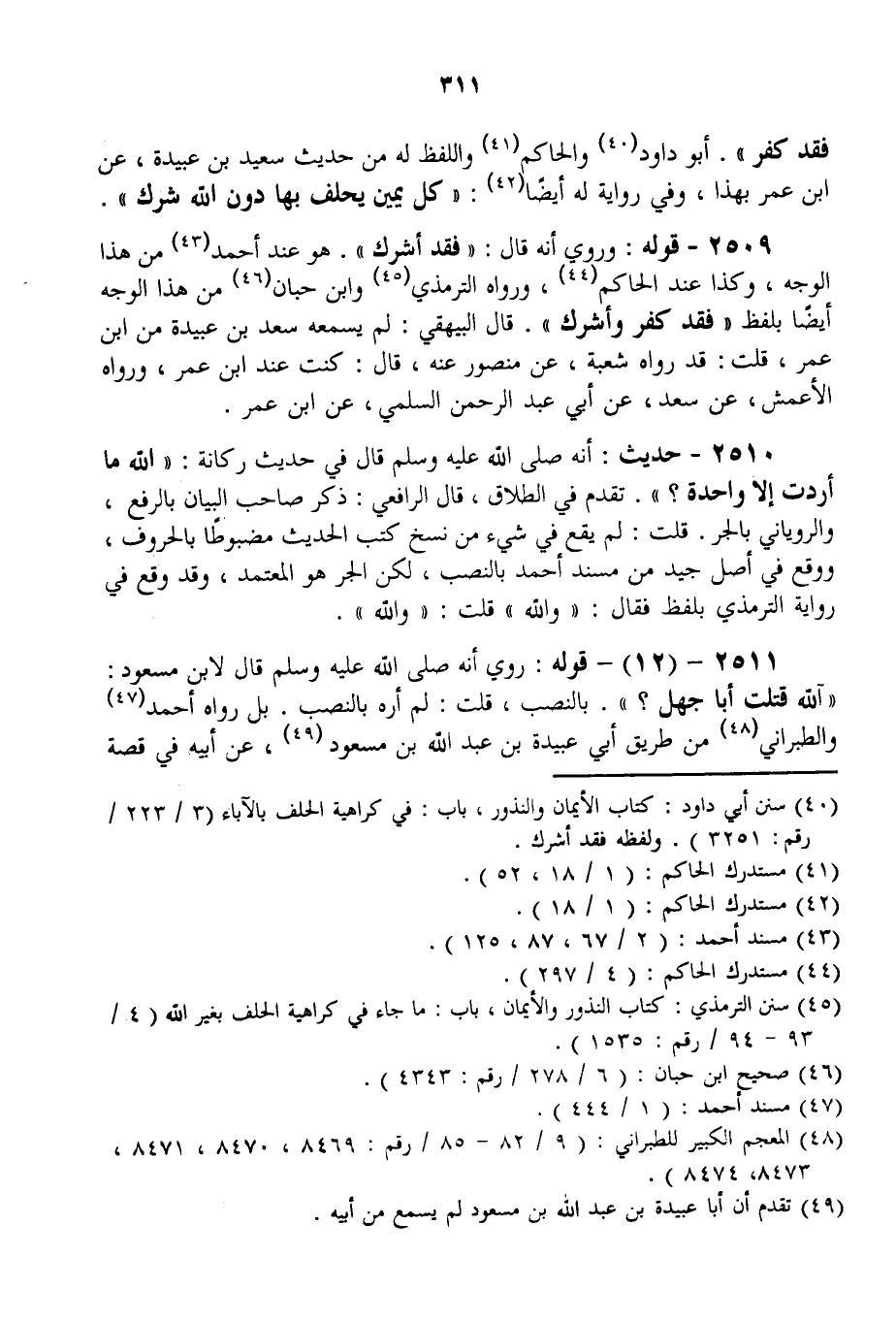 فَقَدْ كَفَرَ» . أَبُو دَاوُد وَالْحَاكِمُ وَاللَّفْظُ لَهُ مِنْ حَدِيثِ سَعِيدِ بْنِ عُبَيْدَةَ، عَنْ ابْنِ عُمَرَ بِهَذَا، وَفِي رِوَايَةٍ لَهُ أَيْضًا: «كُلُّ يَمِينٍ يُحْلَفُ بِهَا دُونَ اللَّهِ شِرْكٌ» . 2509 - قَوْلُهُ: وَرُوِيَ أَنَّهُ قَالَ: «فَقَدْ أَشْرَكَ» . هُوَ عِنْدَ أَحْمَدَ مِنْ هَذَا الْوَجْهِ، وَكَذَا عِنْدَ الْحَاكِمِ، وَرَوَاهُ التِّرْمِذِيُّ وَابْنُ حِبَّانَ مِنْ هَذَا الْوَجْهِ أَيْضًا بِلَفْظِ «فَقَدْ كَفَرَ وَأَشْرَكَ» . قَالَ الْبَيْهَقِيُّ: لَمْ يَسْمَعْهُ سَعْدُ بْنُ عُبَيْدَةَ مِنْ ابْنِ عُمَرَ، قُلْت: قَدْ رَوَاهُ شُعْبَةُ، عَنْ مَنْصُورٍ عَنْهُ، قَالَ: كُنْت عِنْدَ ابْنِ عُمَرَ، وَرَوَاهُ الْأَعْمَشُ، عَنْ سَعْدٍ، عَنْ أَبِي عَبْدِ الرَّحْمَنِ السُّلَمِيِّ، عَنْ ابْنِ عُمَرَ. 2510 - حَدِيثُ: أَنَّهُ - صَلَّى اللَّهُ عَلَيْهِ وَسَلَّمَ - قَالَ فِي حَدِيثِ رُكَانَةَ: «وَاَللَّهِ مَا أَرَدْت إلَّا وَاحِدَةً؟» . تَقَدَّمَ فِي الطَّلَاقِ، قَالَ الرَّافِعِيُّ: ذَكَرَ صَاحِبُ الْبَيَانِ بِالرَّفْعِ، وَالرُّويَانِيُّ بِالْجَرِّ.