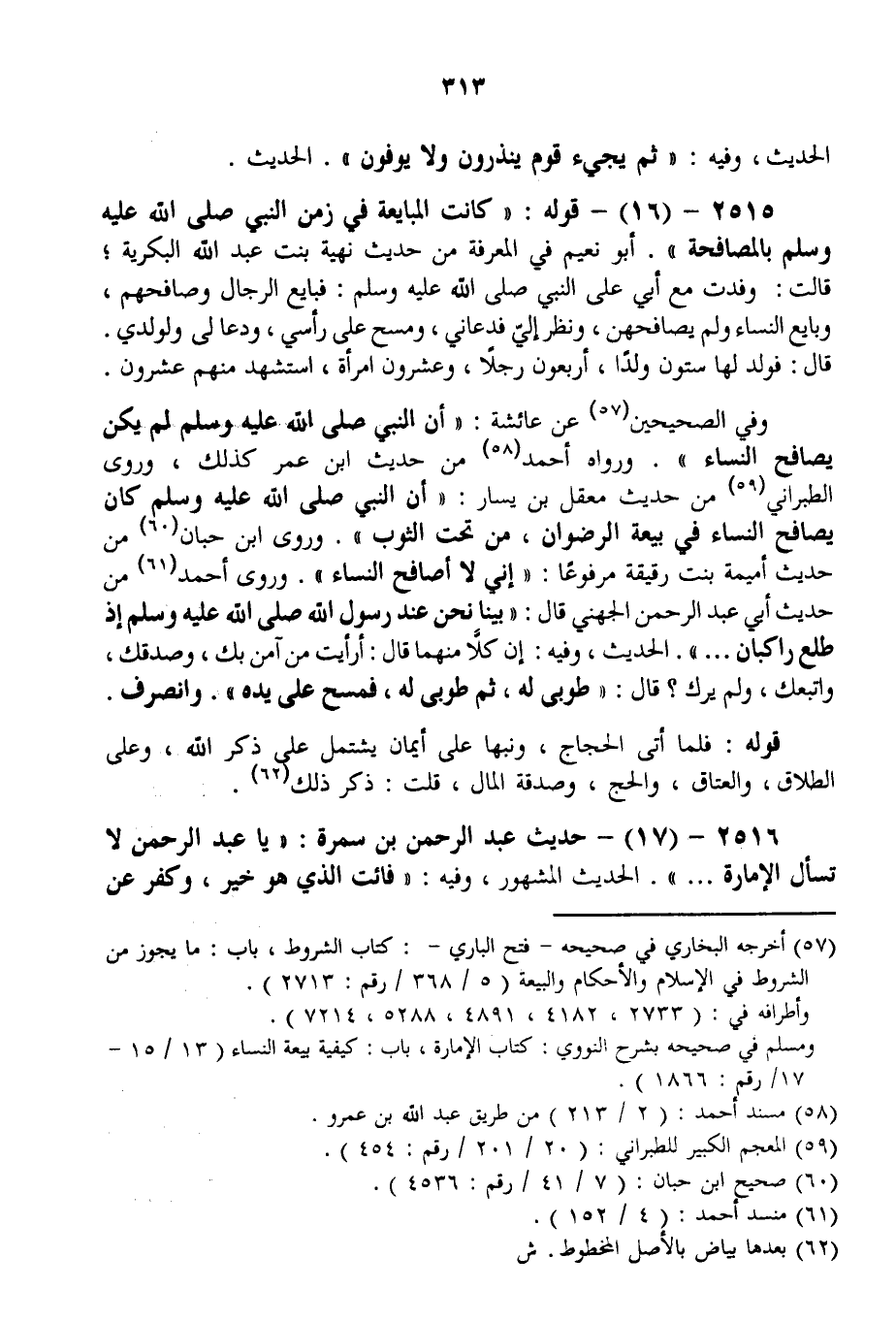 2515 - (16) - قَوْلُهُ: «كَانَتْ الْمُبَايَعَةُ فِي زَمَنِ النَّبِيِّ - صَلَّى اللَّهُ عَلَيْهِ وَسَلَّمَ - بِالْمُصَافَحَةِ» . أَبُو نُعَيْمٍ فِي الْمَعْرِفَةِ مِنْ حَدِيثِ «نُهَيَّةَ بِنْتِ عَبْدِ اللَّهِ الْبَكْرِيَّةِ؛ قَالَتْ: وَفَدْت مَعَ أَبِي عَلَى النَّبِيِّ - صَلَّى اللَّهُ عَلَيْهِ وَسَلَّمَ -: فَبَايَعَ الرِّجَالَ وَصَافَحَهُمْ، وَبَايَعَ النِّسَاءَ وَلَمْ يُصَافِحْهُنَّ، وَنَظَرَ إلَيَّ فَدَعَانِي، وَمَسَحَ عَلَى رَأْسِي، وَدَعَا لِي وَلِوَلَدِي. قَالَ: فَوُلِدَ لَهَا سِتُّونَ وَلَدًا، أَرْبَعُونَ رَجُلًا، وَعِشْرُونَ امْرَأَةً، اُسْتُشْهِدَ مِنْهُمْ عِشْرُونَ» . وَفِي الصَّحِيحَيْنِ عَنْ عَائِشَةَ: «أَنَّ النَّبِيَّ - صَلَّى اللَّهُ عَلَيْهِ وَسَلَّمَ - لَمْ يَكُنْ يُصَافِحْ النِّسَاءَ» . وَرَوَاهُ أَحْمَدُ مِنْ حَدِيثِ ابْنِ عُمَرَ كَذَلِكَ، وَرَوَى الطَّبَرَانِيُّ مِنْ حَدِيثِ مَعْقِلِ بْنِ يَسَارِ: «أَنَّ النَّبِيَّ - صَلَّى اللَّهُ عَلَيْهِ وَسَلَّمَ - كَانَ يُصَافِحُ النِّسَاءَ فِي بَيْعَةِ الرِّضْوَانِ، مِنْ تَحْتِ الثَّوْبِ» . وَرَوَى ابْنُ حِبَّانَ مِنْ حَدِيثِ أُمَيْمَةَ بِنْتِ رَقِيقَةَ مَرْفُوعًا: «إنِّي لَا أُصَافِحُ النِّسَاءَ» .