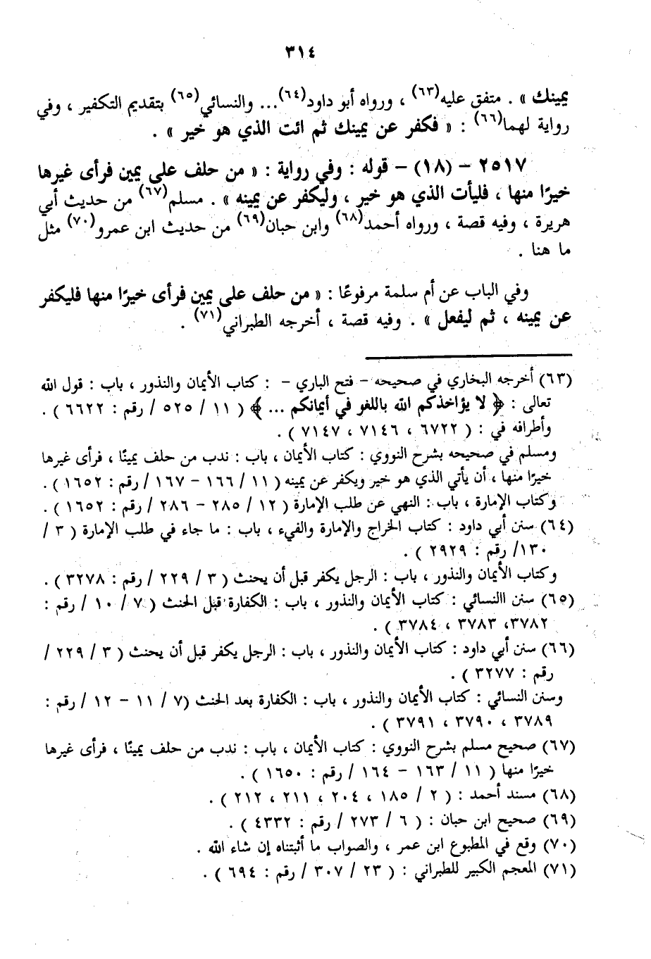 2517 - (18) - قَوْلُهُ: وَفِي رِوَايَةِ: «مَنْ حَلَفَ عَلَى يَمِينٍ فَرَأَى غَيْرَهَا خَيْرًا مِنْهَا، فَلْيَأْتِ الَّذِي هُوَ خَيْرٌ، وَلْيُكَفِّرْ عَنْ يَمِينِهِ» مُسْلِمٌ مِنْ حَدِيثِ أَبِي هُرَيْرَةَ، وَفِيهِ قِصَّةٌ، وَرَوَاهُ أَحْمَدُ وَابْنُ حِبَّانَ مِنْ حَدِيثِ ابْنِ عَمْرٍو مِثْلَ مَا هُنَا. وَفِي الْبَابِ عَنْ أُمِّ سَلَمَةَ مَرْفُوعًا: «مَنْ حَلَفَ عَلَى يَمِينٍ فَرَأَى خَيْرًا مِنْهَا فَلْيُكَفِّرْ عَنْ يَمِينِهِ، ثُمَّ لْيَفْعَلْ» . وَفِيهِ قِصَّةٌ، أَخْرَجَهُ الطَّبَرَانِيُّ.