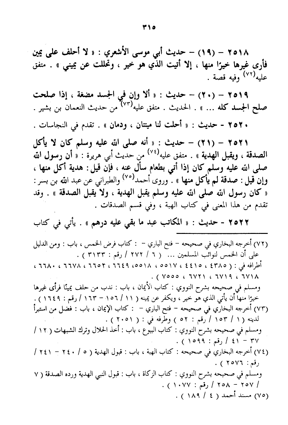 2519 - (20) - حَدِيثُ: «أَلَا وَإِنَّ فِي الْجَسَدِ مُضْغَةً، إذَا صَلَحَتْ صَلَحَ الْجَسَدُ كُلُّهُ. . .» الْحَدِيثُ. مُتَّفَقٌ عَلَيْهِ مِنْ حَدِيثِ النُّعْمَانِ بْنِ بَشِيرٍ. 2520 - حَدِيثُ: «أُحِلَّتْ لَنَا مَيْتَتَانِ، وَدَمَانِ» . تَقَدَّمَ فِي النَّجَاسَاتِ.
