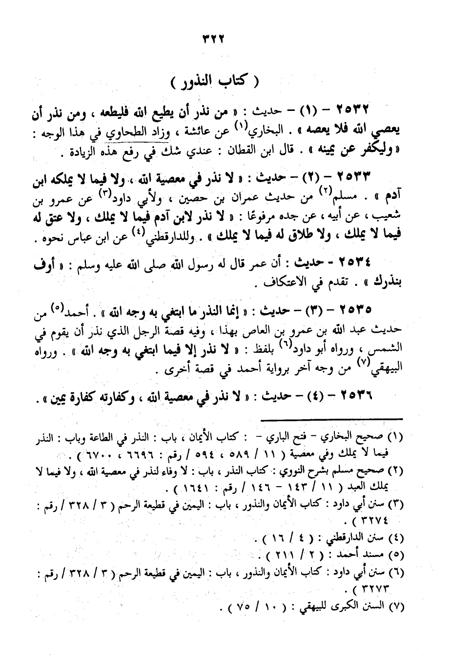 (كِتَابُ النُّذُورِ) 2532 - (1) - حَدِيثُ: «مَنْ نَذَرَ أَنْ يُطِيعَ اللَّهَ فَلْيُطِعْهُ، وَمَنْ نَذَرَ أَنْ يَعْصِيَ اللَّهَ فَلَا يَعْصِهِ» . الْبُخَارِيُّ عَنْ عَائِشَةَ، وَزَادَ الطَّحَاوِيُّ فِي هَذَا الْوَجْهِ: «وَلْيُكَفِّرْ عَنْ يَمِينِهِ» . قَالَ ابْنُ الْقَطَّانِ: عِنْدِي شَكٌّ فِي رَفْعِ هَذِهِ الزِّيَادَةِ. 2533 - (2) - حَدِيثُ: «لَا نَذْرَ فِي مَعْصِيَةِ اللَّهِ، وَلَا فِيمَا لَا يَمْلِكُهُ ابْنُ آدَمَ» . مُسْلِمٌ مِنْ حَدِيثِ عِمْرَانَ بْنِ حُصَيْنٍ، وَلِأَبِي دَاوُد عَنْ عَمْرٍو بْنِ شُعَيْبٍ، عَنْ أَبِيهِ، عَنْ جَدِّهِ مَرْفُوعًا: «لَا نَذْرَ لِابْنِ آدَمَ فِيمَا لَا يَمْلِكُ، وَلَا عِتْقَ لَهُ فِيمَا لَا يَمْلِكُ، وَلَا طَلَاقَ لَهُ فِيمَا لَا يَمْلِكُ» . وَلِلدَّارَقُطْنِيِّ عَنْ ابْنِ عَبَّاسٍ نَحْوُهُ. 2534 - حَدِيثُ: «أَنَّ عُمَرَ قَالَ لَهُ رَسُولُ اللَّهِ - صَلَّى اللَّهُ عَلَيْهِ وَسَلَّمَ -: أَوْفِ بِنَذْرِك» . تَقَدَّمَ فِي الِاعْتِكَافِ. 2535 - (3) - حَدِيثُ: «إنَّمَا النَّذْرُ مَا اُبْتُغِيَ بِهِ وَجْهُ اللَّهِ» . أَحْمَدُ مِنْ حَدِيثِ عَبْدِ اللَّهِ بْنِ عَمْرِو بْنِ الْعَاصِ بِهَذَا، وَفِيهِ قِصَّةُ الرَّجُلِ الَّذِي نَذَرَ أَنْ يَقُومَ فِي الشَّمْسِ، وَرَوَاهُ أَبُو دَاوُد بِلَفْظِ: «لَا نَذْرَ إلَّا فِيمَا اُبْتُغِيَ بِهِ وَجْهُ اللَّهِ» . وَرَوَاهُ الْبَيْهَقِيُّ مِنْ وَجْهٍ آخَرَ بِرِوَايَةِ أَحْمَدَ فِي قِصَّةٍ أُخْرَى. 2536 - (4) - حَدِيثُ: «لَا نَذْرَ فِي مَعْصِيَةِ اللَّهِ، وَكَفَّارَتُهُ كَفَّارَةُ يَمِينٍ» .