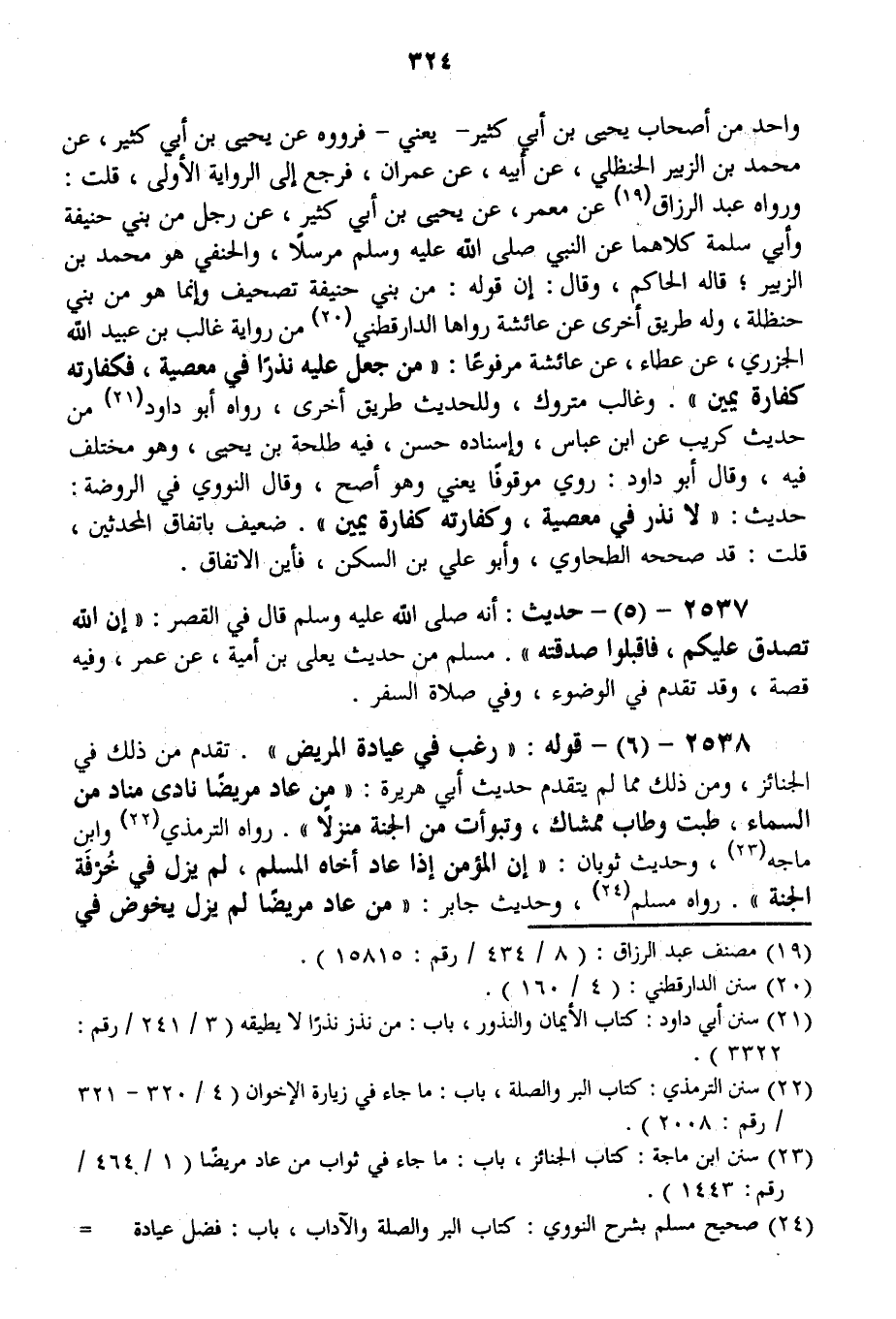 وَاحِدٍ مِنْ أَصْحَابِ يَحْيَى بْنِ أَبِي كَثِيرٍ - يَعْنِي - فَرَوَوْهُ عَنْ يَحْيَى بْنِ أَبِي كَثِيرٍ، عَنْ مُحَمَّدِ بْنِ الزُّبَيْرِ الْحَنْظَلِيِّ، عَنْ أَبِيهِ، عَنْ عِمْرَانَ، فَرَجَعَ إلَى الرِّوَايَةِ الْأُولَى، قُلْت: وَرَوَاهُ عَبْدُ الرَّزَّاقِ عَنْ مَعْمَرٍ، عَنْ يَحْيَى بْنِ أَبِي كَثِيرٍ، عَنْ رَجُلٍ مِنْ بَنِي حَنِيفَةَ وَأَبِي سَلَمَةَ كِلَاهُمَا عَنْ النَّبِيِّ - صَلَّى اللَّهُ عَلَيْهِ وَسَلَّمَ - مُرْسَلًا، وَالْحَنَفِيُّ هُوَ مُحَمَّدُ بْنُ الزُّبَيْرِ؛ قَالَهُ الْحَاكِمُ، وَقَالَ: إنَّ قَوْلَهُ: مِنْ بَنِي حَنِيفَةَ تَصْحِيفٌ وَإِنَّمَا هُوَ مِنْ بَنِي حَنْظَلَةَ، وَلَهُ طَرِيقٌ أُخْرَى عَنْ عَائِشَةَ رَوَاهَا الدَّارَقُطْنِيُّ مِنْ رِوَايَةِ غَالِبِ بْن عُبَيْدِ اللَّهِ الْجَزَرِيِّ، عَنْ عَطَاءٍ، عَنْ عَائِشَةَ مَرْفُوعًا: «مَنْ جَعَلَ عَلَيْهِ نَذْرًا فِي مَعْصِيَةٍ، فَكَفَّارَتُهُ كَفَّارَةُ يَمِينٍ» .