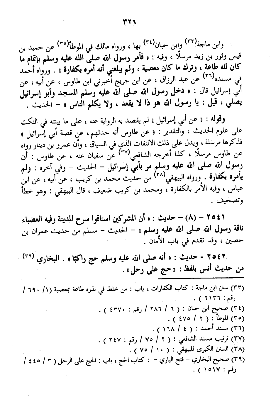 وَابْنُ مَاجَهْ وَابْنُ حِبَّانَ بِهَا، وَرَوَاهُ مَالِكٌ فِي الْمُوَطَّأِ عَنْ حُمَيْدِ بْنِ قَيْسٍ وَثَوْرِ بْنِ زَيْدٍ مُرْسَلًا، وَفِيهِ: «فَأَمَرَ رَسُولُ اللَّهِ - صَلَّى اللَّهُ عَلَيْهِ وَسَلَّمَ - بِإِتْمَامِ مَا كَانَ لِلَّهِ طَاعَةً، وَتَرْكِ مَا كَانَ مَعْصِيَةً، وَلَمْ يَبْلُغْنِي أَنَّهُ أَمَرَهُ بِكَفَّارَةٍ» . وَرَوَاهُ أَحْمَدُ فِي مُسْنَدِهِ عَنْ عَبْدِ الرَّزَّاقِ، عَنْ ابْنِ جُرَيْجٍ أَخْبَرَنِي ابْنُ طَاوُسٍ، عَنْ أَبِيهِ، عَنْ أَبِي إسْرَائِيلَ قَالَ: «دَخَلَ رَسُولُ اللَّهِ - صَلَّى اللَّهُ عَلَيْهِ وَسَلَّمَ - الْمَسْجِدَ وَأَبُو إسْرَائِيلَ يُصَلِّي، قِيلَ: يَا رَسُولَ اللَّهِ هُوَ ذَا لَا يَقْعُدُ، وَلَا يُكَلِّمُ النَّاسَ - الْحَدِيثُ» . وَقَوْلُهُ: " عَنْ أَبِي إسْرَائِيلَ " لَمْ يَقْصِدْ بِهِ الرِّوَايَةَ عَنْهُ، عَلَى مَا بَيَّنْته فِي النُّكَتِ عَلَى عُلُومِ الْحَدِيثِ، وَالتَّقْدِيرُ: " عَنْ طَاوُسٍ أَنَّهُ حَدَّثَهُمْ، عَنْ قِصَّةِ أَبِي إسْرَائِيلَ " فَذَكَرَهَا مُرْسَلَةً، وَيَدُلُّ عَلَى ذَلِكَ الِالْتِفَاتُ الَّذِي فِي السِّيَاقِ، وَأَنَّ عَمْرَو بْنَ دِينَارٍ رَوَاهُ عَنْ طَاوُسٍ مُرْسَلًا، كَذَا أَخْرَجَهُ الشَّافِعِيُّ عَنْ سُفْيَانَ عَنْهُ، عَنْ طَاوُسٍ: أَنَّ رَسُولَ اللَّهِ - صَلَّى اللَّهُ عَلَيْهِ وَسَلَّمَ - مَرَّ بِأَبِي إسْرَائِيلَ - الْحَدِيثُ - وَفِي آخِرِهِ: وَلَمْ يَأْمُرْهُ بِكَفَّارَةٍ. وَرَوَاهُ الْبَيْهَقِيُّ مِنْ حَدِيثِ مُحَمَّدِ بْنِ كُرَيْبٍ، عَنْ أَبِيهِ، عَنْ ابْنِ عَبَّاسٍ، وَفِيهِ الْأَمْرُ بِالْكَفَّارَةِ، وَمُحَمَّدُ بْنُ كُرَيْبٍ ضَعِيفٌ.
