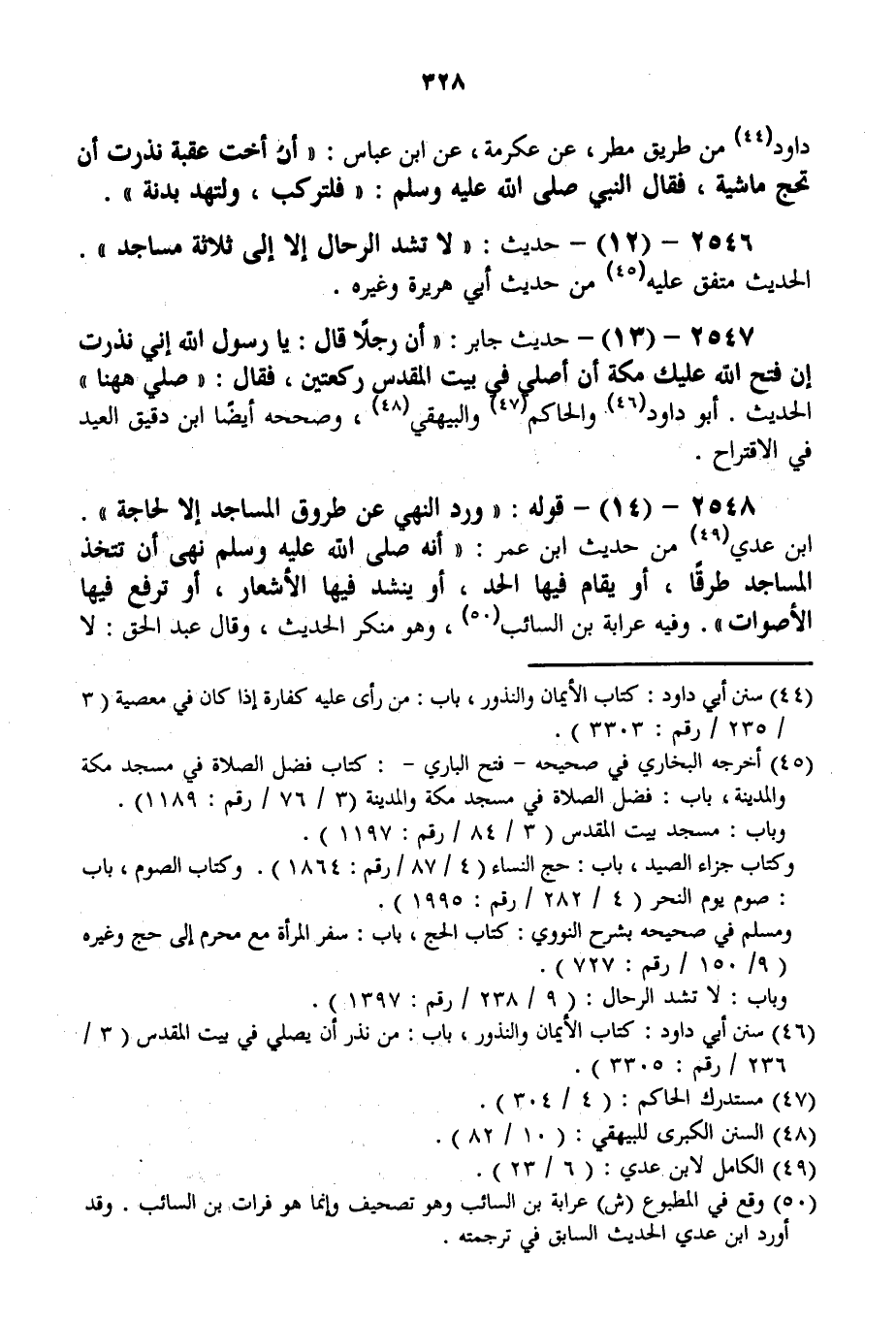 2546 - (12) - حَدِيثُ: «لَا تُشَدُّ الرِّحَالُ إلَّا إلَى ثَلَاثَةِ مَسَاجِدَ» . الْحَدِيثُ مُتَّفَقٌ عَلَيْهِ مِنْ حَدِيثِ أَبِي هُرَيْرَةَ وَغَيْرِهِ. 2547 - (13) - حَدِيثُ جَابِرٍ: «أَنَّ رَجُلًا قَالَ: يَا رَسُولَ اللَّهِ إنِّي نَذَرْت إنْ فَتَحَ اللَّهُ عَلَيْك مَكَّةَ أَنْ أُصَلِّيَ فِي بَيْتِ الْمَقْدِسِ رَكْعَتَيْنِ فَقَالَ: صَلِّي هَا هُنَا» الْحَدِيثُ. أَبُو دَاوُد وَالْحَاكِمُ وَالْبَيْهَقِيُّ، وَصَحَّحَهُ أَيْضًا ابْنُ دَقِيقِ الْعِيدِ فِي الِاقْتِرَاحِ.