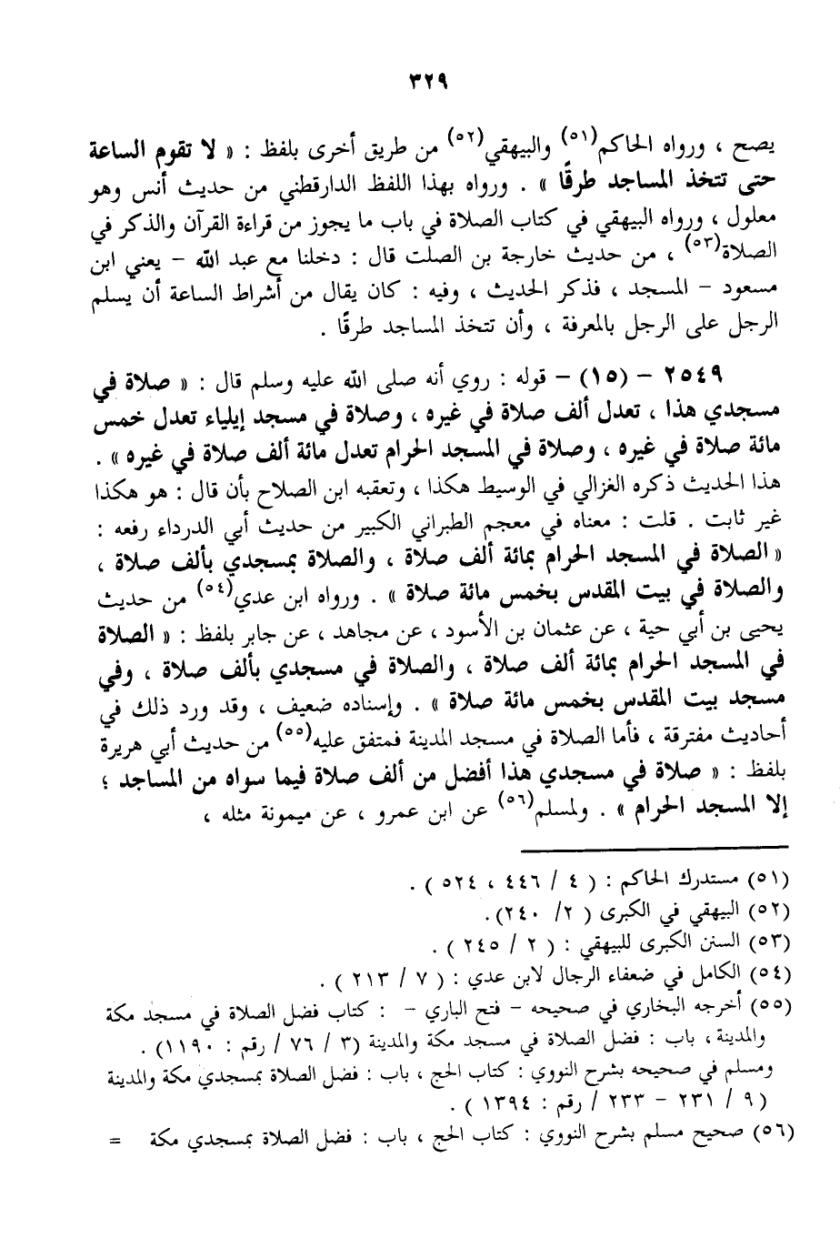 قُلْت: مَعْنَاهُ فِي مُعْجَمِ الطَّبَرَانِيِّ الْكَبِيرِ مِنْ حَدِيثِ أَبِي الدَّرْدَاءِ رَفَعَهُ: «الصَّلَاةُ فِي الْمَسْجِدِ الْحَرَامِ بِمِائَةِ أَلْفِ صَلَاةٍ، وَالصَّلَاةُ بِمَسْجِدِي بِأَلْفِ صَلَاةٍ، وَالصَّلَاةُ فِي بَيْتِ الْمَقْدِسِ بِخَمْسِ مِائَةِ صَلَاةٍ» . وَرَوَاهُ ابْنُ عَدِيٍّ مِنْ حَدِيثِ يَحْيَى بْنِ أَبِي حَيَّةَ، عَنْ عُثْمَانَ بْنِ الْأَسْوَدِ، عَنْ مُجَاهِدٍ، عَنْ جَابِرٍ بِلَفْظِ: «الصَّلَاةُ فِي الْمَسْجِدِ الْحَرَامِ بِمِائَةِ أَلْفِ صَلَاةٍ، وَالصَّلَاةُ فِي مَسْجِدِي بِأَلْفِ صَلَاةٍ، وَفِي مَسْجِدِ بَيْتِ الْمَقْدِسِ بِخَمْسِ مِائَةِ صَلَاةٍ» . وَإِسْنَادُهُ ضَعِيفٌ، وَقَدْ وَرَدَ ذَلِكَ فِي أَحَادِيثَ مُفْتَرِقَةٍ، فَأَمَّا الصَّلَاةُ فِي مَسْجِدِ الْمَدِينَةِ فَمُتَّفَقٌ عَلَيْهِ مِنْ حَدِيثِ أَبِي هُرَيْرَةَ بِلَفْظِ: «صَلَاةٌ فِي مَسْجِدِي هَذَا أَفْضَلُ مِنْ أَلْفِ صَلَاةٍ فِيمَا سِوَاهُ مِنْ الْمَسَاجِدِ؛ إلَّا الْمَسْجِدُ الْحَرَامُ» . وَلِمُسْلِمٍ عَنْ ابْنِ عَمْرٍو، عَنْ مَيْمُونَةَ مِثْلُهُ،