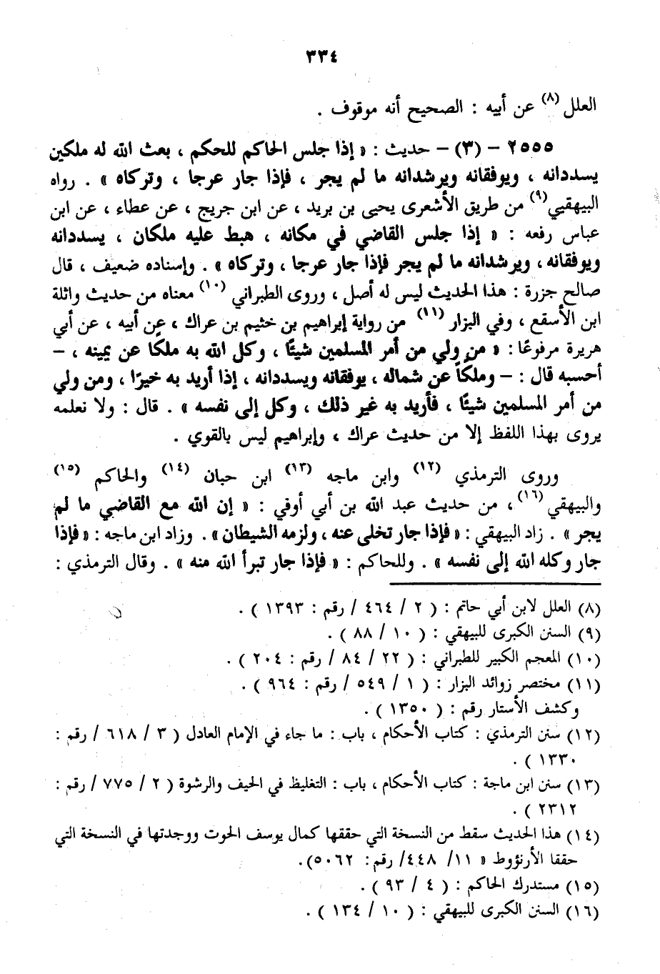 وَرَوَى التِّرْمِذِيُّ وَابْنُ مَاجَهْ وَابْنُ حِبَّانَ وَالْحَاكِمُ وَالْبَيْهَقِيُّ، مِنْ حَدِيثِ عَبْدِ اللَّهِ بْنِ أَبِي أَوْفَى: «إنَّ اللَّهَ مَعَ الْقَاضِي مَا لَمْ يَجُرْ» .