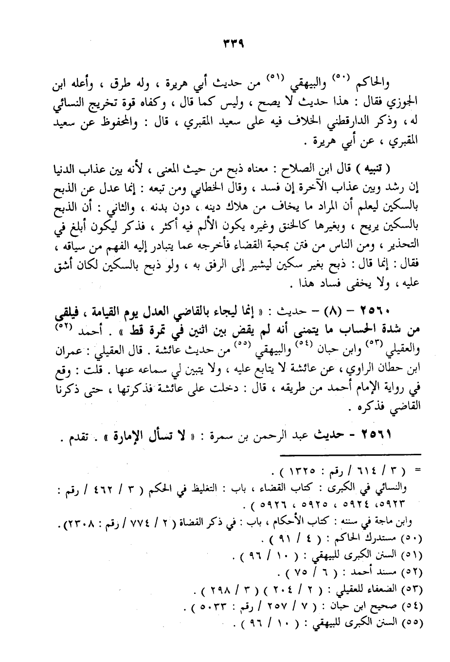 2560 - (8) - حَدِيثُ: «إنَّمَا يُجَاءُ بِالْقَاضِي الْعَدْلِ يَوْمَ الْقِيَامَةِ، فَيَلْقَى مِنْ شِدَّةِ الْحِسَابِ مَا يَتَمَنَّى أَنَّهُ لَمْ يَقْضِ بَيْنَ اثْنَيْنِ فِي تَمْرَةٍ قَطُّ» . أَحْمَدُ وَالْعُقَيْلِيُّ وَابْنُ حِبَّانَ وَالْبَيْهَقِيُّ مِنْ حَدِيثِ عَائِشَةَ. قَالَ الْعُقَيْلِيُّ: عِمْرَانُ بْنُ حِطَّانِ الرَّاوِي، عَنْ عَائِشَةَ لَا يُتَابَعُ عَلَيْهِ، وَلَا يَتَبَيَّنُ لِي سَمَاعُهُ عَنْهَا. قُلْت: وَقَعَ فِي رِوَايَةِ الْإِمَامِ أَحْمَدَ مِنْ طَرِيقِهِ، قَالَ: دَخَلْت عَلَى عَائِشَةَ فَذَكَّرْتهَا، حَتَّى ذَكَرْنَا الْقَاضِيَ فَذَكَرَهُ.