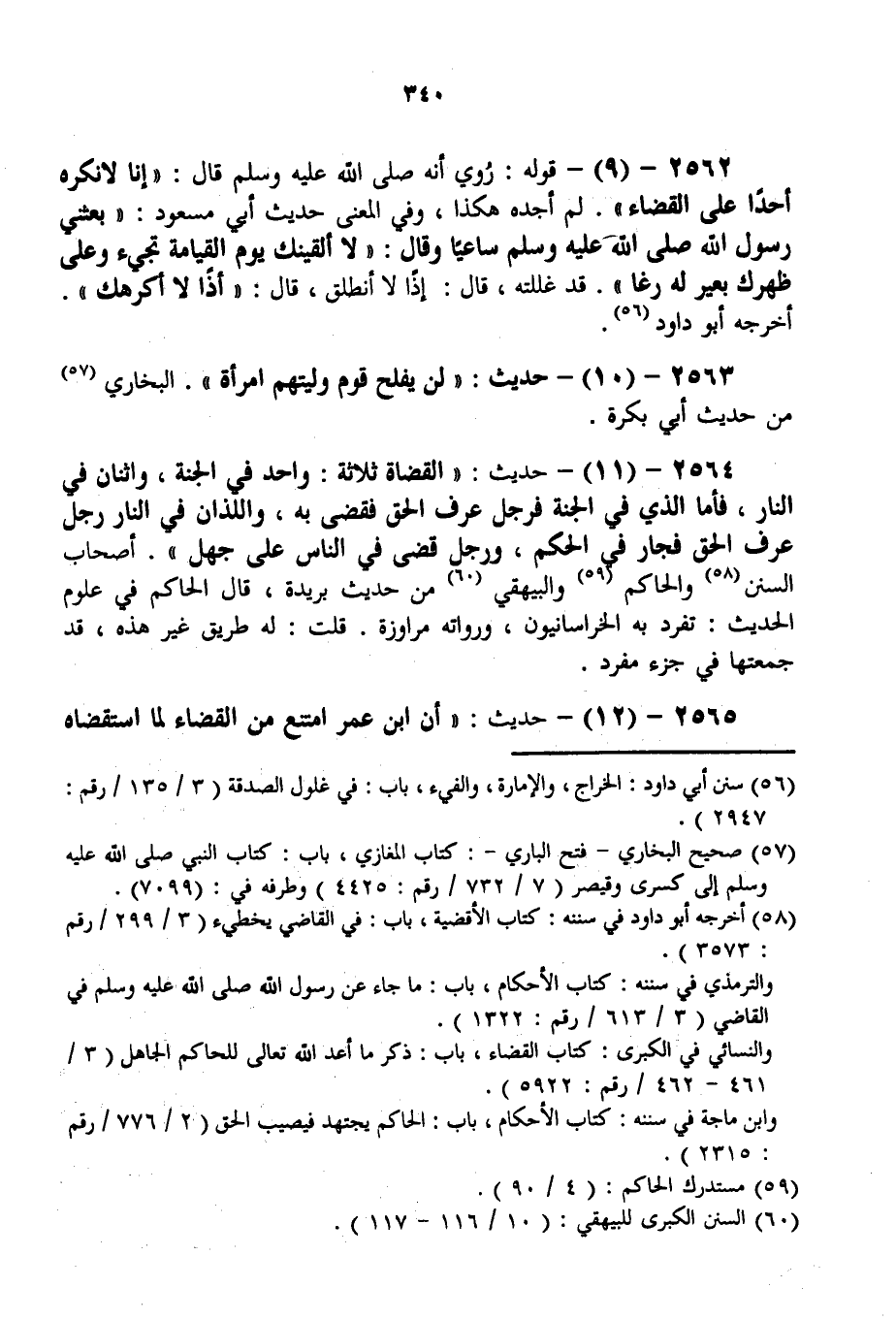 2564 - (11) - حَدِيثُ: «الْقُضَاةُ ثَلَاثَةٌ: وَاحِدٌ فِي الْجَنَّةِ، وَاثْنَانِ فِي النَّارِ، فَأَمَّا الَّذِي فِي الْجَنَّةِ فَرَجُلٌ عَرَفَ الْحَقَّ فَقَضَى بِهِ، وَاَللَّذَانِ فِي النَّارِ رَجُلٌ عَرَفَ الْحَقَّ فَجَارَ فِي الْحُكْمِ، وَرَجُلٌ قَضَى فِي النَّاسِ عَلَى جَهْلٍ» . أَصْحَابُ السُّنَنِ وَالْحَاكِمُ وَالْبَيْهَقِيُّ مِنْ حَدِيثِ بُرَيْدَةَ، قَالَ الْحَاكِمُ فِي عُلُومِ الْحَدِيثِ: تَفَرَّدَ بِهِ الْخُرَاسَانِيُّونَ، وَرُوَاتُهُ مَرَاوِزَةٌ. قُلْت: لَهُ طُرُقٌ غَيْرُ هَذِهِ، قَدْ جَمَعْتهَا فِي جُزْءٍ مُفْرَدٍ.