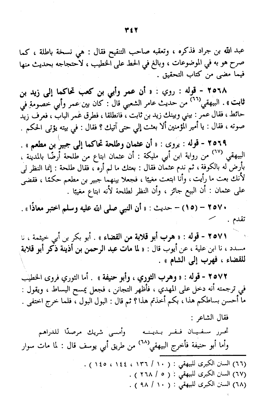2569 - قَوْلُهُ: يُرْوَى: " أَنَّ عُثْمَانَ وَطَلْحَةَ تَحَاكَمَا إلَى جُبَيْرِ بْنِ مُطْعَمٍ ". الْبَيْهَقِيُّ مِنْ رِوَايَةِ ابْنِ أَبِي مُلَيْكَةَ: أَنَّ عُثْمَانَ ابْتَاعَ مِنْ طَلْحَةَ أَرْضًا بِالْمَدِينَةِ. بِأَرْضٍ لَهُ بِالْكُوفَةِ، ثُمَّ نَدِمَ عُثْمَانُ فَقَالَ: بِعْتُك مَا لَمْ أَرَهُ، فَقَالَ طَلْحَةُ: إنَّمَا النَّظَرُ لِي لِأَنَّك بِعْت مَا رَأَيْت، وَأَنَا ابْتَعْت مَغِيبًا، فَجَعَلَا بَيْنَهُمَا جُبَيْرَ بْنَ مُطْعَمٍ حَكَمًا، فَقَضَى عَلَى عُثْمَانَ: أَنَّ الْبَيْعَ جَائِزٌ، وَأَنَّ النَّظَرَ لِطَلْحَةَ لِأَنَّهُ ابْتَاعَ مَغِيبًا.