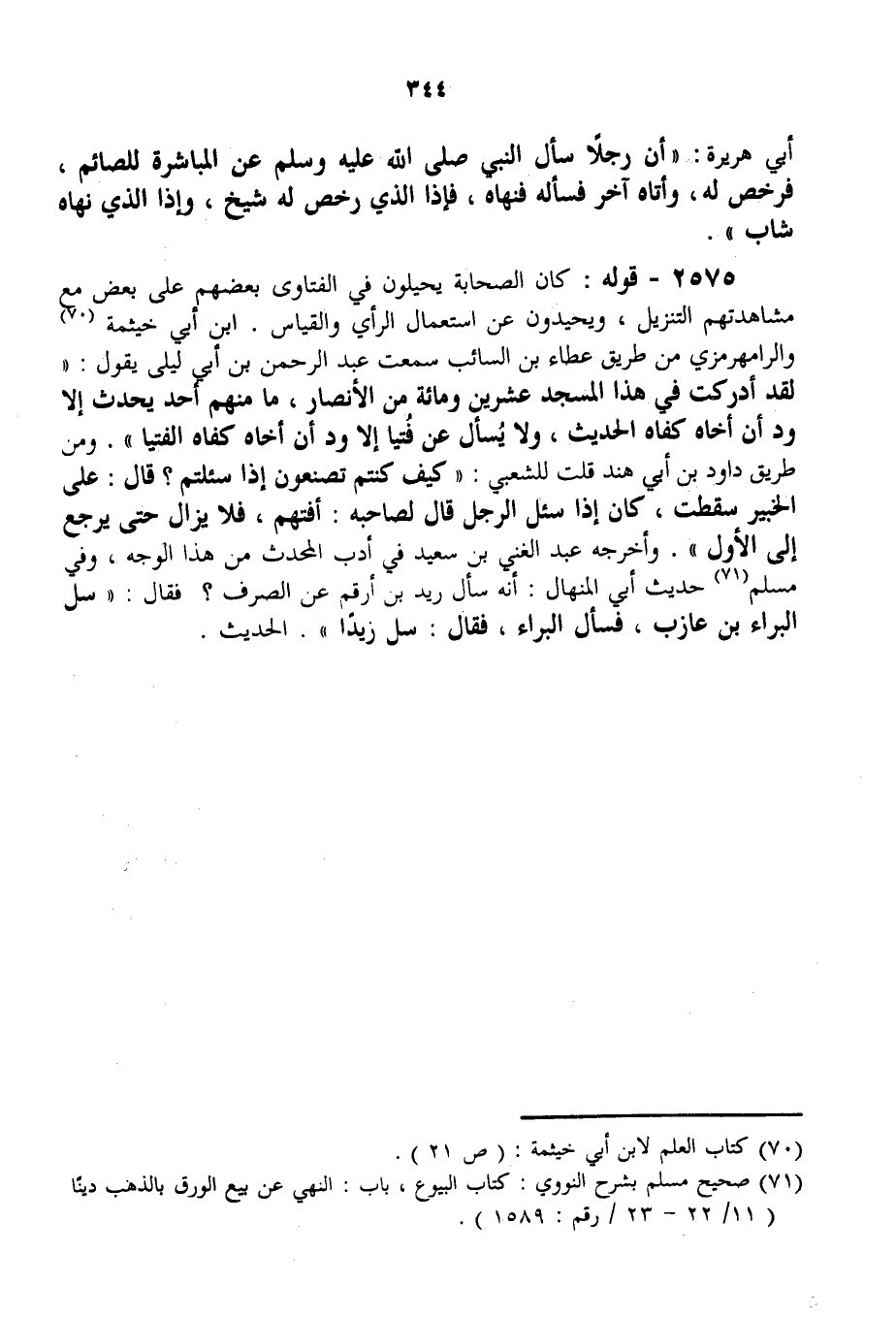 2575 - قَوْلُهُ: كَانَ الصَّحَابَةُ يُحِيلُونَ فِي الْفَتَاوَى بَعْضُهُمْ عَلَى بَعْضٍ مَعَ مُشَاهَدَتِهِمْ التَّنْزِيلَ، وَيَحِيدُونَ عَنْ اسْتِعْمَالِ الرَّأْيِ وَالْقِيَاسِ. ابْنُ أَبِي خَيْثَمَةَ والرامهرمزي مِنْ طَرِيقِ عَطَاءِ بْنِ السَّائِبِ سَمِعْت عَبْدَ الرَّحْمَنِ بْنَ أَبِي لَيْلَى يَقُولُ: " لَقَدْ أَدْرَكْت فِي هَذَا الْمَسْجِدِ عِشْرِينَ وَمِائَةً مِنْ الْأَنْصَارِ، مَا مِنْهُمْ أَحَدٌ يُحَدِّثُ إلَّا وَدَّ أَنَّ أَخَاهُ كَفَاهُ الْحَدِيثَ، وَلَا يُسْأَلُ عَنْ فُتْيَا إلَّا وَدَّ أَنَّ أَخَاهُ كَفَاهُ الْفُتْيَا ". وَمِنْ طَرِيقِ دَاوُد بْنِ أَبِي هِنْدٍ قُلْت لِلشَّعْبِيِّ: " كَيْفَ كُنْتُمْ تَصْنَعُونَ إذَا سُئِلْتُمْ؟ قَالَ: عَلَى الْخَبِيرِ سَقَطْت، كَانَ إذَا سُئِلَ الرَّجُلُ قَالَ لِصَاحِبِهِ: أَفْتِهِمْ، فَلَا يَزَالُ حَتَّى يَرْجِعَ إلَى الْأَوَّلِ " وَأَخْرَجَهُ عَبْدُ الْغَنِيِّ بْنُ سَعِيدٍ فِي أَدَبِ الْمُحَدِّثِ مِنْ هَذَا الْوَجْهِ، وَفِي مُسْلِمٍ حَدِيثُ أَبِي الْمِنْهَالِ: أَنَّهُ سَأَلَ زَيْدَ بْنَ أَرْقَمَ عَنْ الصَّرْفِ؟ فَقَالَ: " سَلْ الْبَرَاءَ بْنَ عَازِبٍ، فَسَأَلَ الْبَرَاءَ، فَقَالَ: سَلْ زَيْدًا ". الْحَدِيثُ.