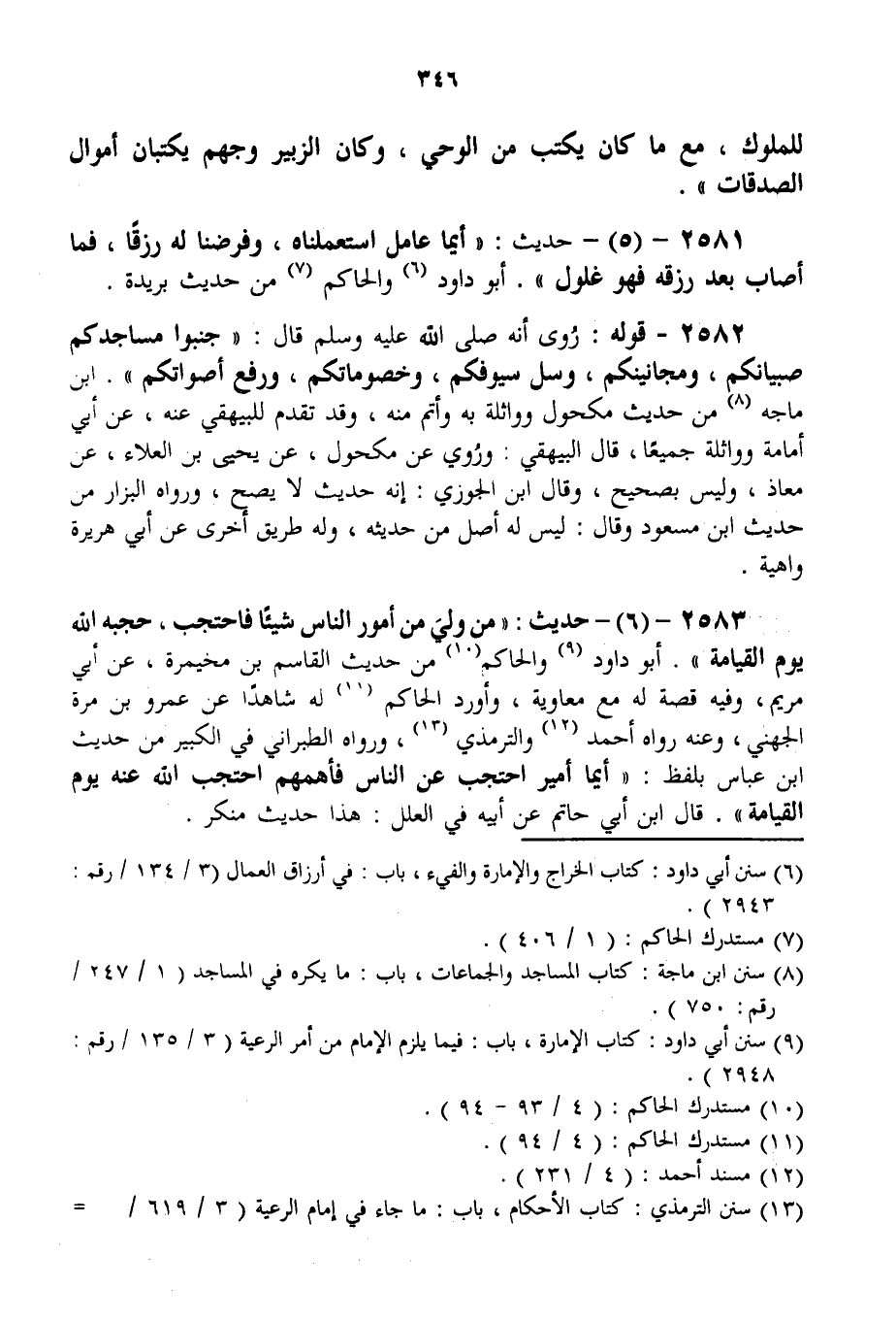 2583 - (6) - حَدِيثُ: «مَنْ وَلِيَ مِنْ أُمُورِ النَّاسِ شَيْئًا فَاحْتَجَبَ، حَجَبَهُ اللَّهُ يَوْمَ الْقِيَامَةِ» . أَبُو دَاوُد وَالْحَاكِمُ مِنْ حَدِيثِ الْقَاسِمِ بْنِ مُخَيْمِرَةَ، عَنْ أَبِي مَرْيَمَ، وَفِيهِ قِصَّةٌ لَهُ مَعَ مُعَاوِيَةَ، وَأَوْرَدَ الْحَاكِمُ لَهُ شَاهِدًا عَنْ عَمْرِو بْنِ مُرَّةَ الْجُهَنِيِّ، وَعَنْهُ رَوَاهُ أَحْمَدُ وَالتِّرْمِذِيُّ، وَرَوَاهُ الطَّبَرَانِيُّ فِي الْكَبِيرِ مِنْ حَدِيثِ ابْنِ عَبَّاسٍ بِلَفْظِ: «أَيُّمَا أَمِيرٍ احْتَجَبَ عَنْ النَّاسِ فَأَهَمَّهُمْ احْتَجَبَ اللَّهُ عَنْهُ يَوْمَ الْقِيَامَةِ» . قَالَ ابْنُ أَبِي حَاتِمٍ عَنْ أَبِيهِ فِي الْعِلَلِ: هَذَا حَدِيثٌ مُنْكَرٌ.