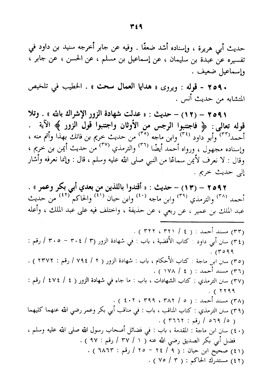 2591 - (12) - حَدِيثُ: «عَدَلَتْ شَهَادَةُ الزُّورِ الْإِشْرَاكَ بِاَللَّهِ. وَتَلَا قَوْله تَعَالَى: {فَاجْتَنِبُوا الرِّجْسَ مِنَ الأَوْثَانِ وَاجْتَنِبُوا قَوْلَ الزُّورِ} [الحج: 30] الْآيَةُ» . أَحْمَدُ وَأَبُو دَاوُد وَابْنُ مَاجَهْ مِنْ حَدِيثِ خُرَيْمِ بْنِ فَاتِكٍ بِهَذَا وَأَتَمَّ مِنْهُ، وَإِسْنَادُهُ مَجْهُولٌ، وَرَوَاهُ أَحْمَدُ أَيْضًا وَالتِّرْمِذِيُّ مِنْ حَدِيثِ أَيْمَنَ بْنُ خُرَيْمٍ، وَقَالَ: لَا نَعْرِفُ لِأَيْمَنَ سَمَاعًا مِنْ النَّبِيِّ - صَلَّى اللَّهُ عَلَيْهِ وَسَلَّمَ -، قَالَ: وَإِنَّمَا نَعْرِفُهُ وَأَشَارَ إلَى حَدِيثِ خُرَيْمٍ.